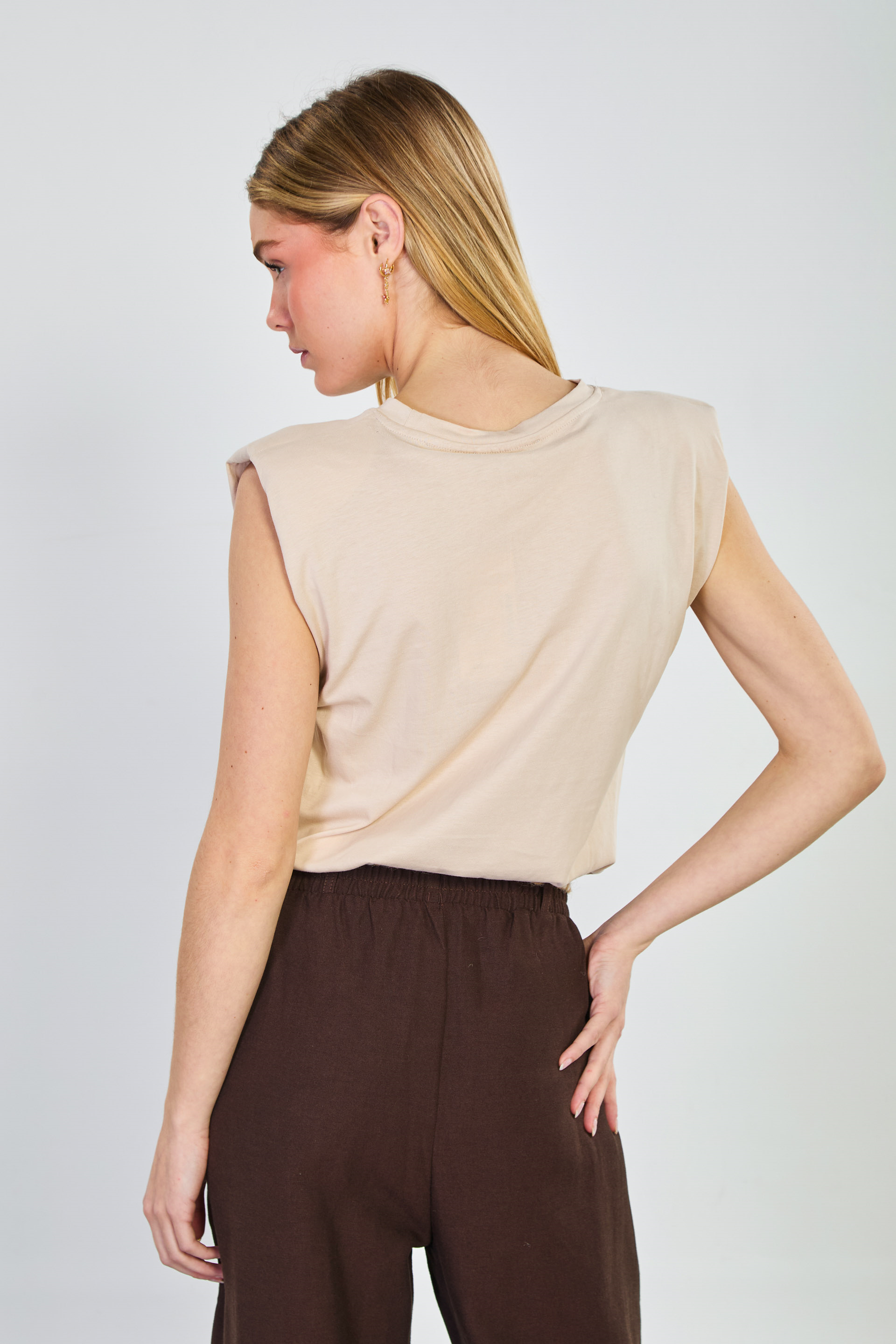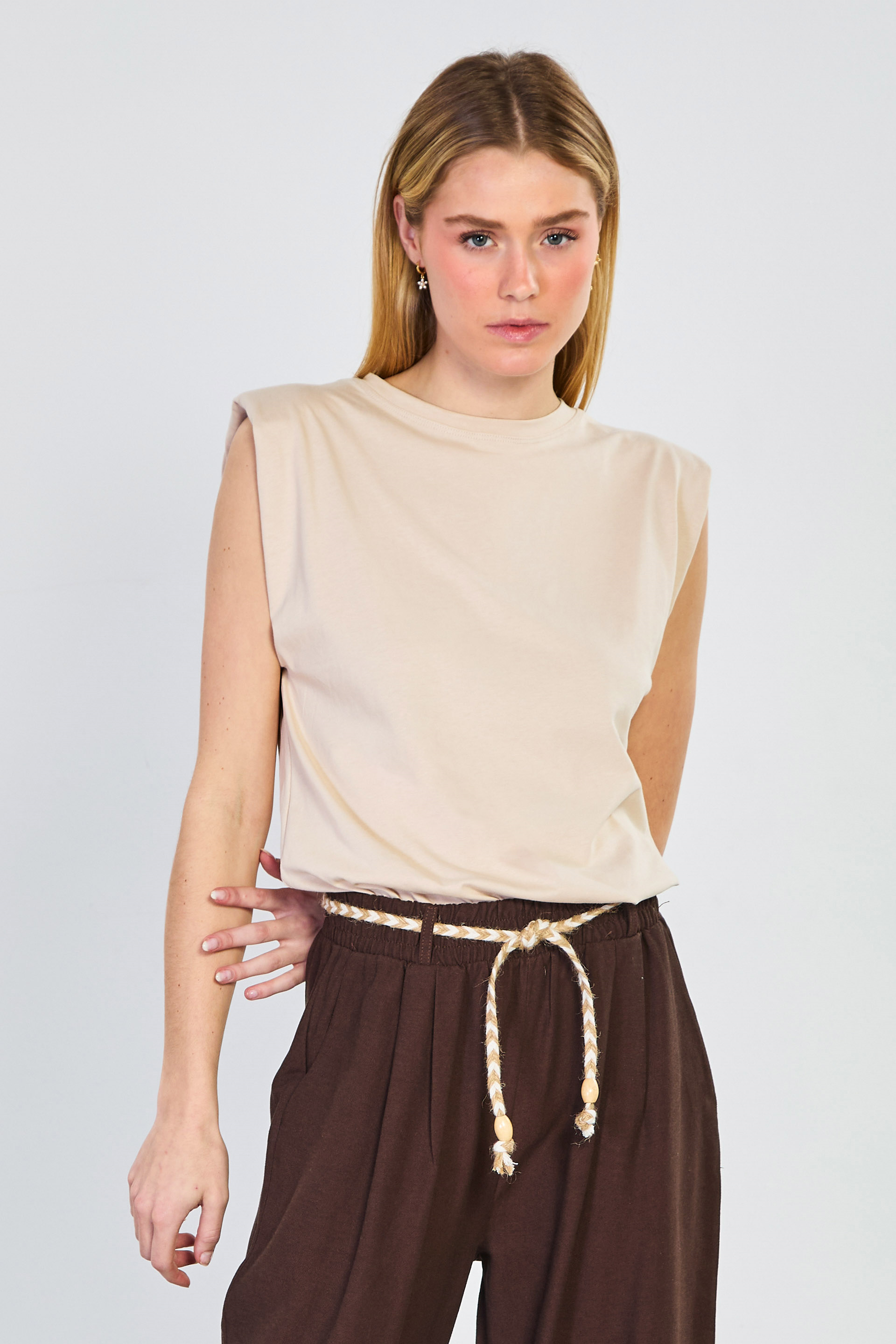 Kadın Vatkalı Kolsuz T-Shirt - Taş