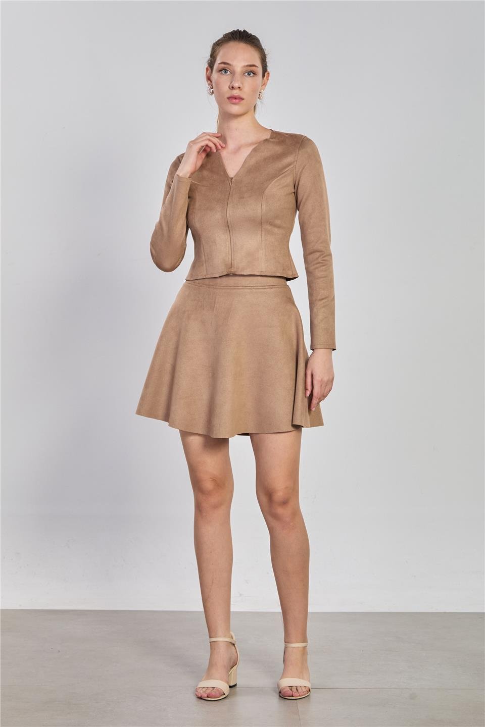 Kadın Volanlı Kısa Süet Etek - Vizon
