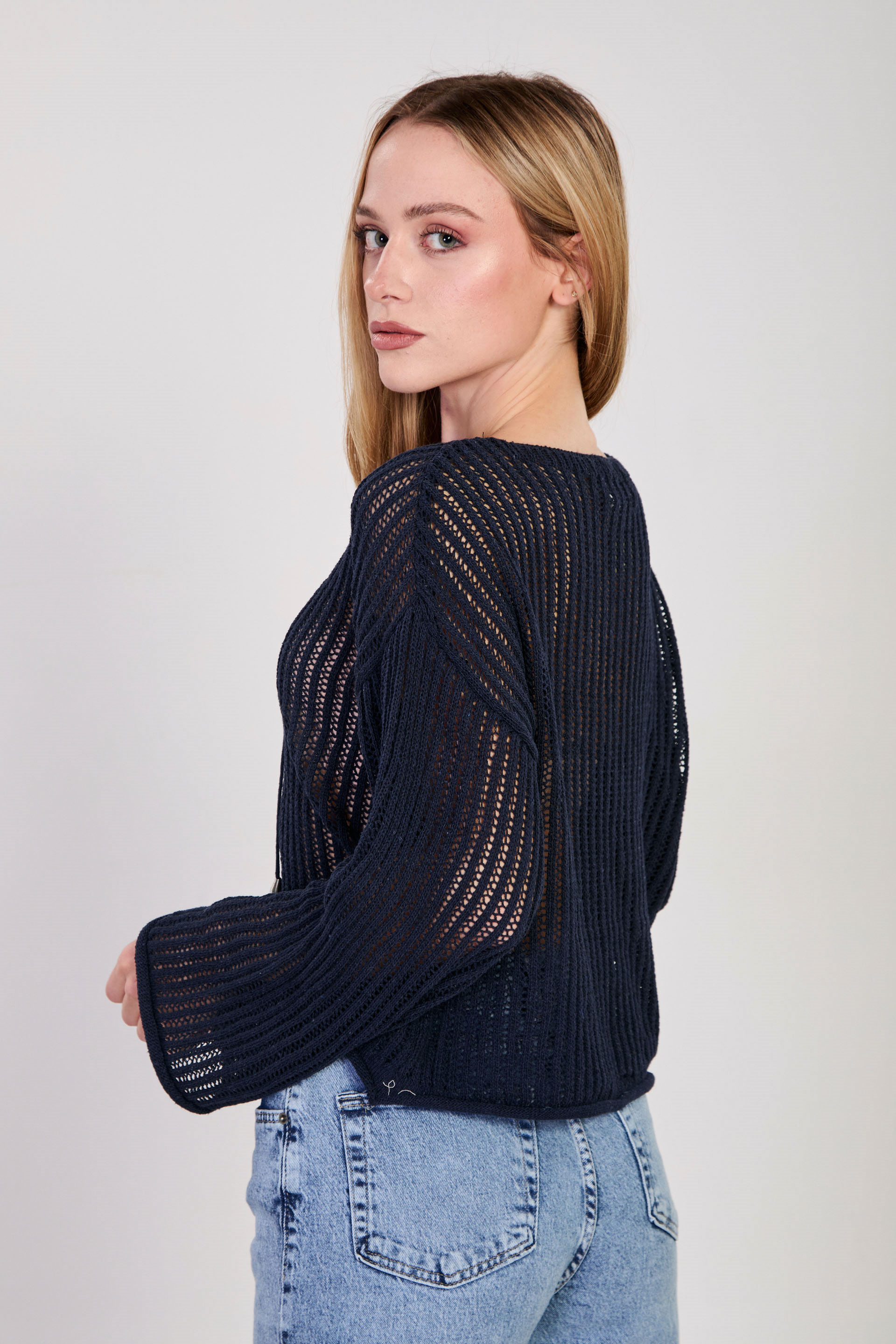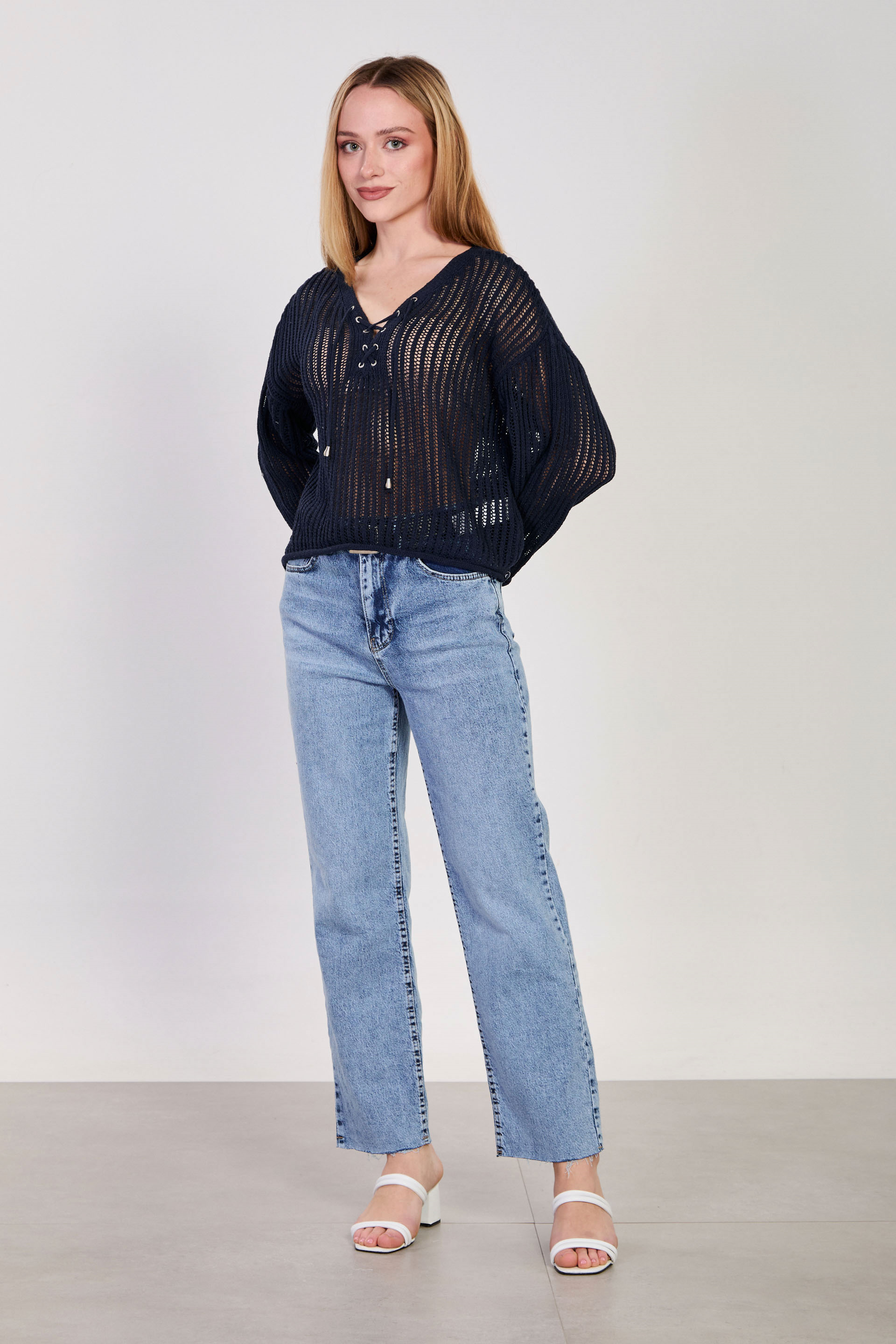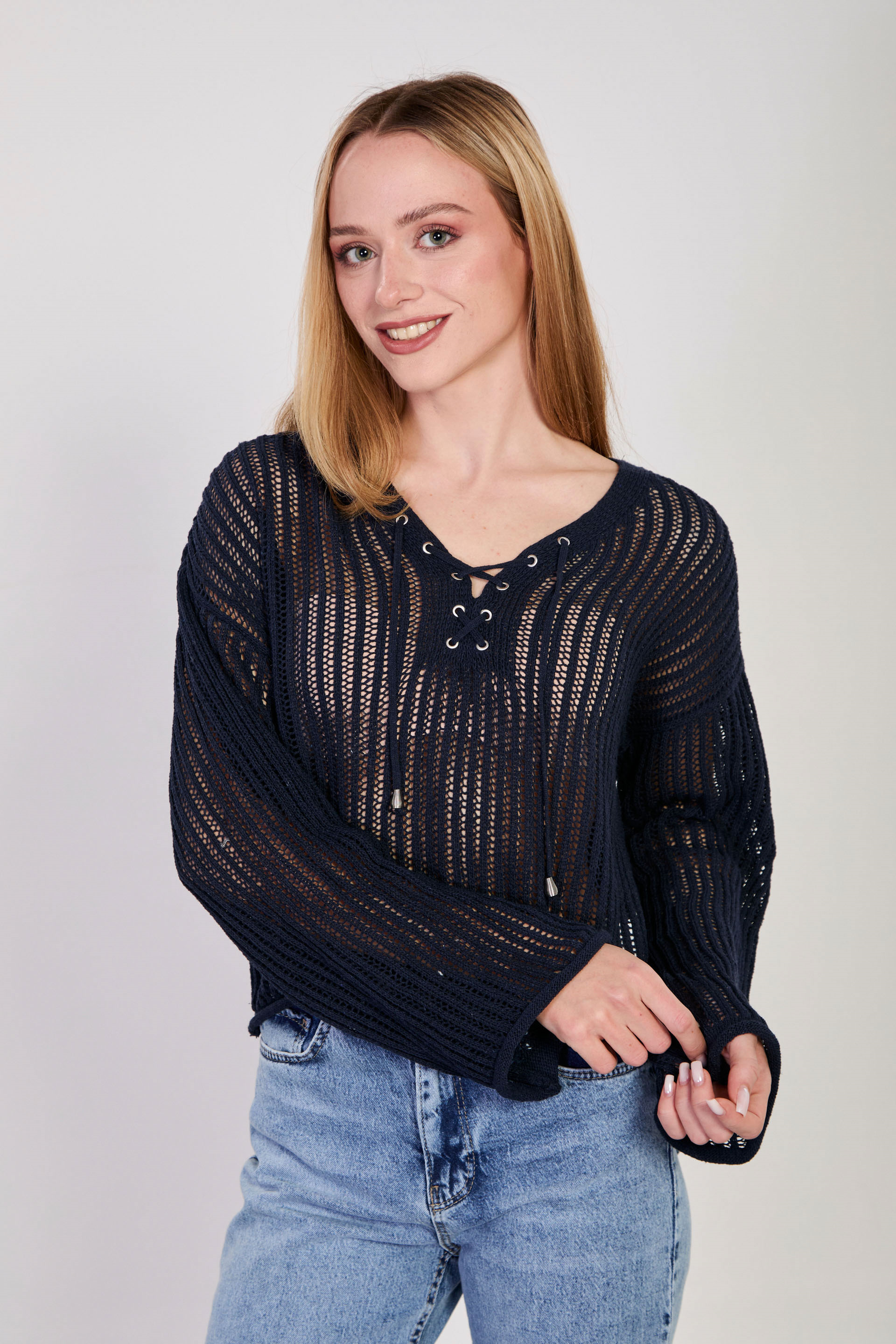 Kadın Yaka Bağcıklı Ajurlu Kazak - Lacivert