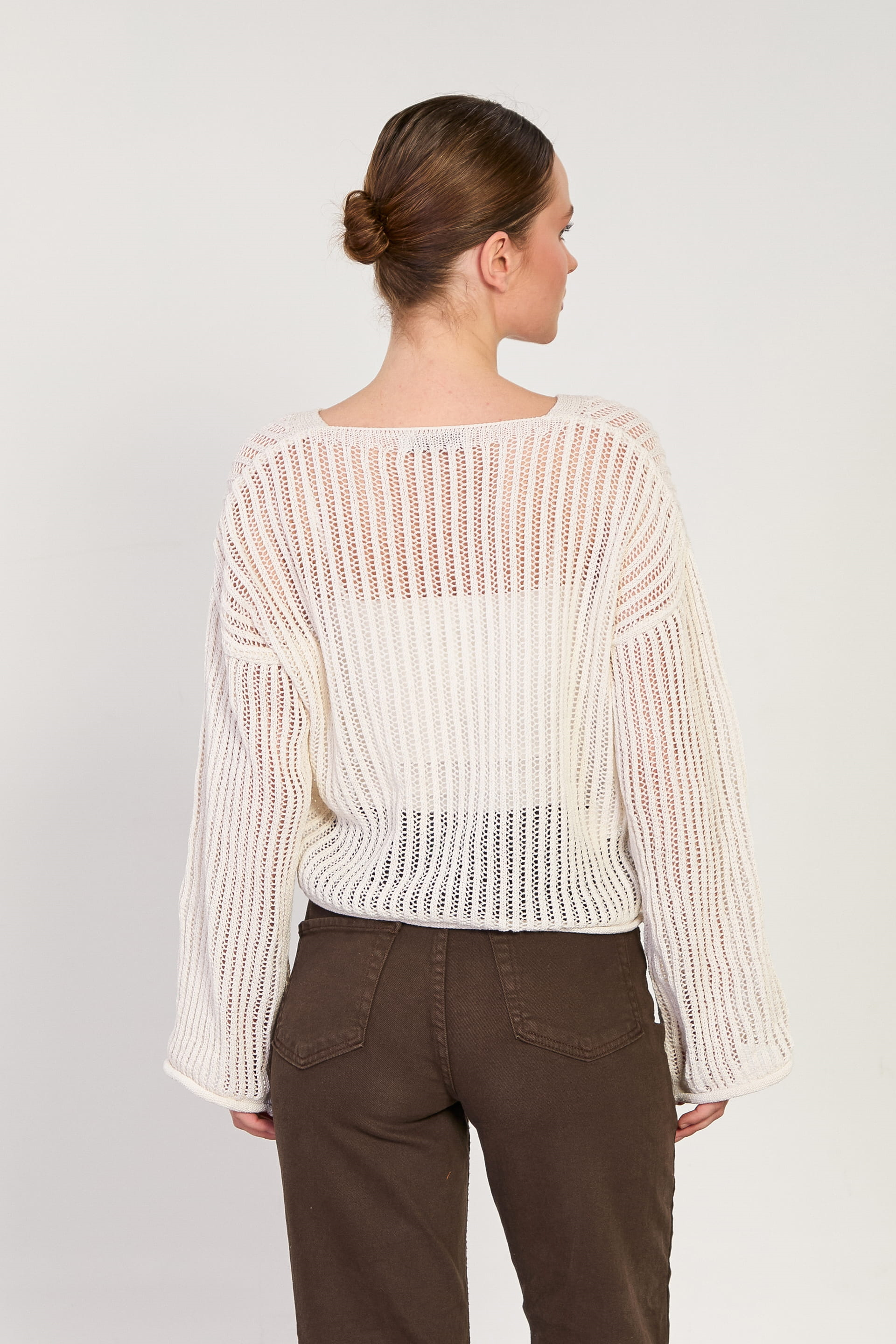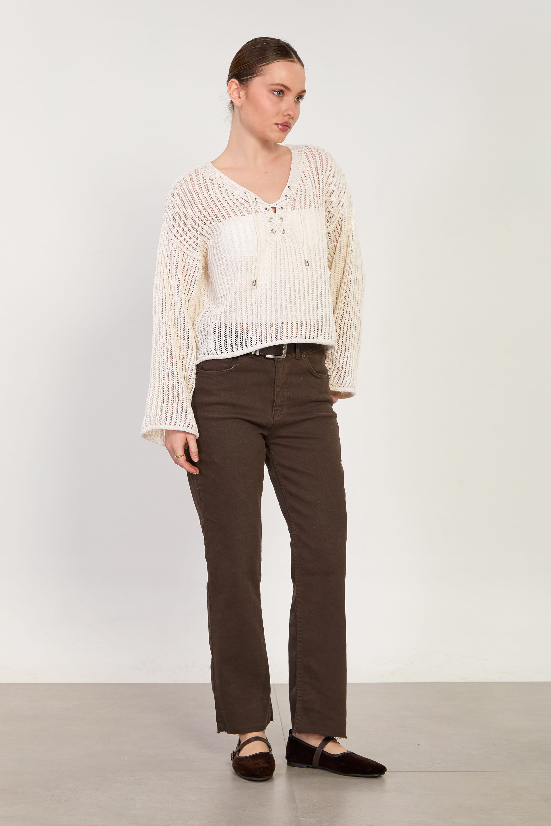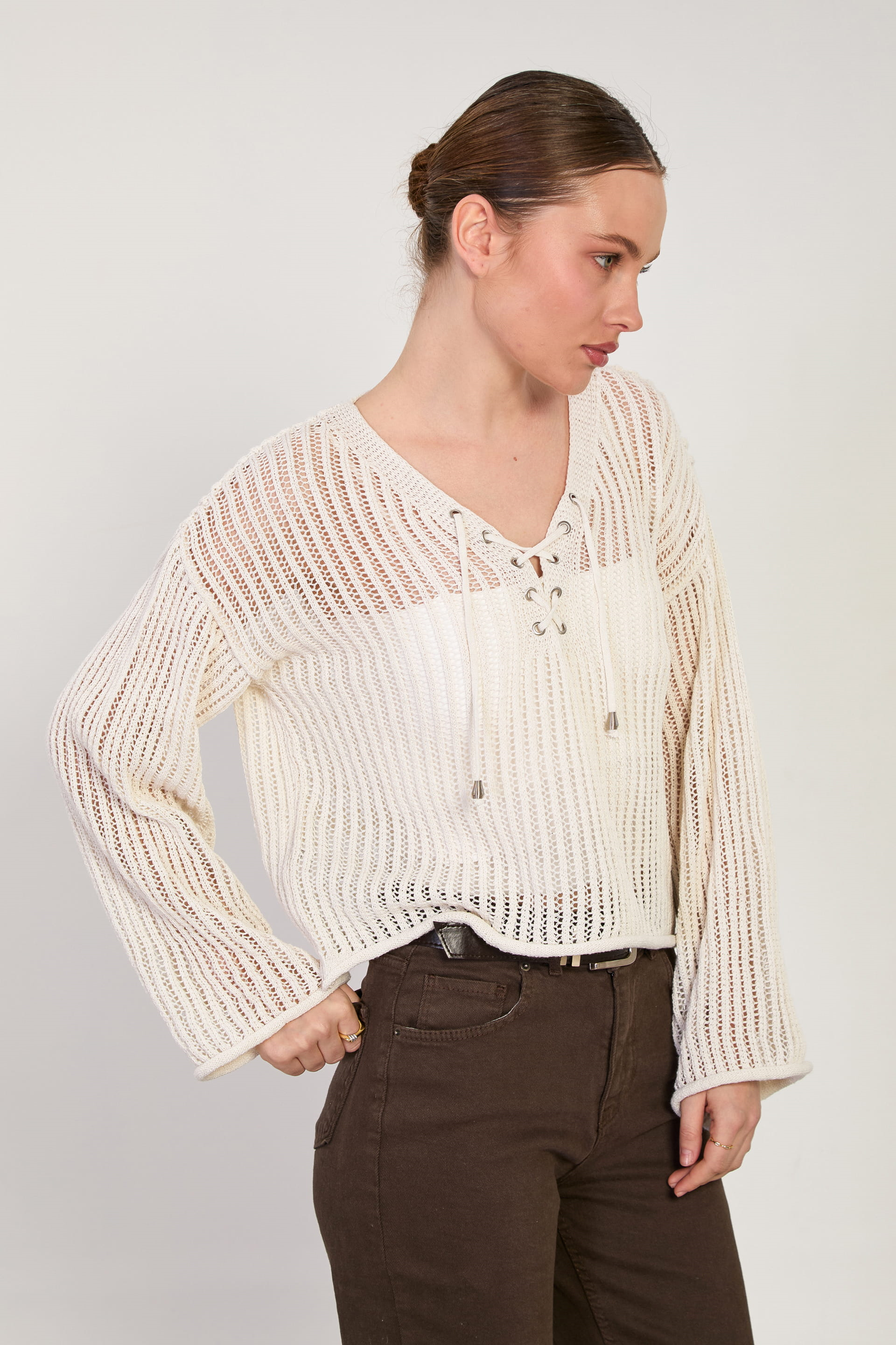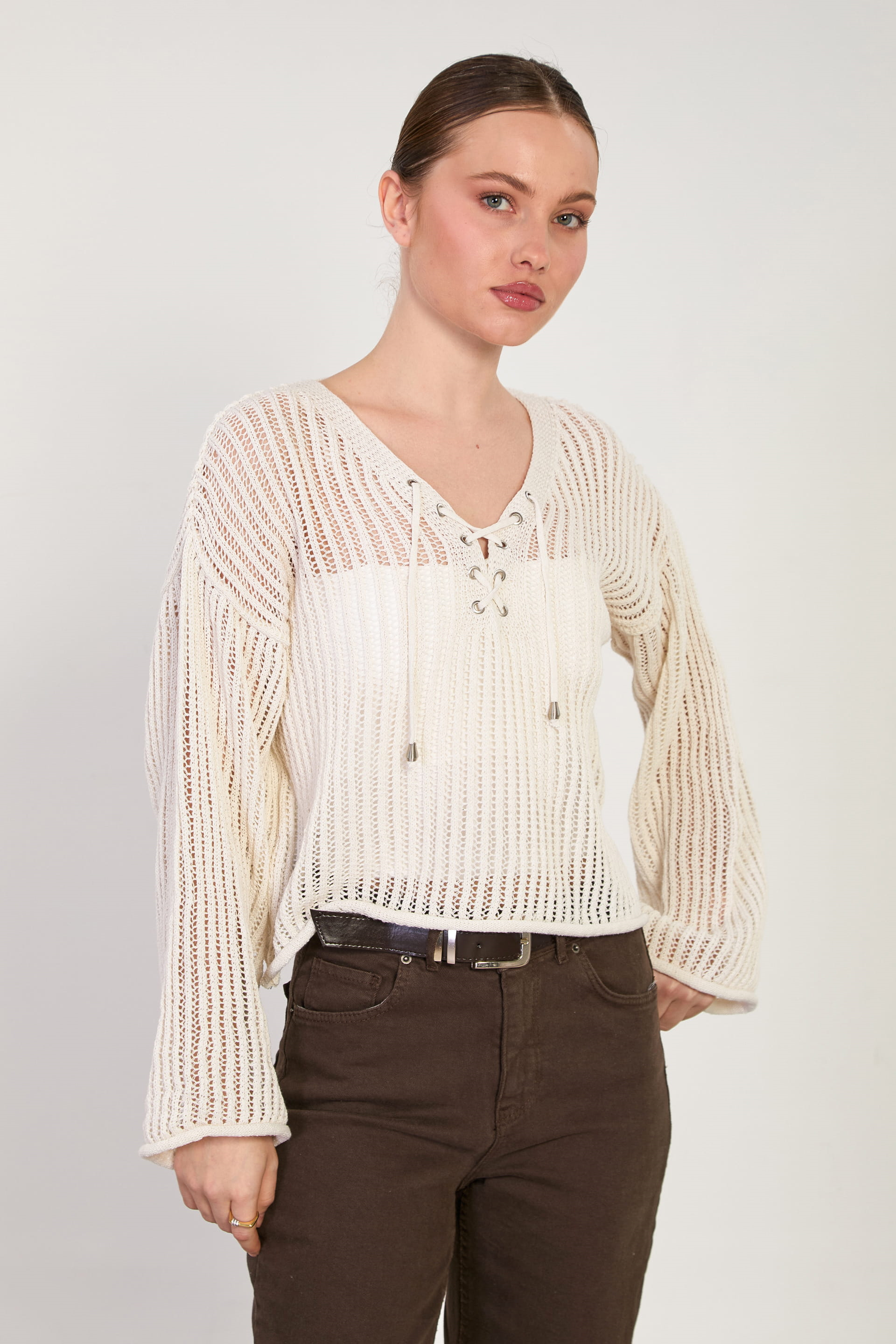 Kadın Yaka Bağcıklı Ajurlu Kazak - Natural