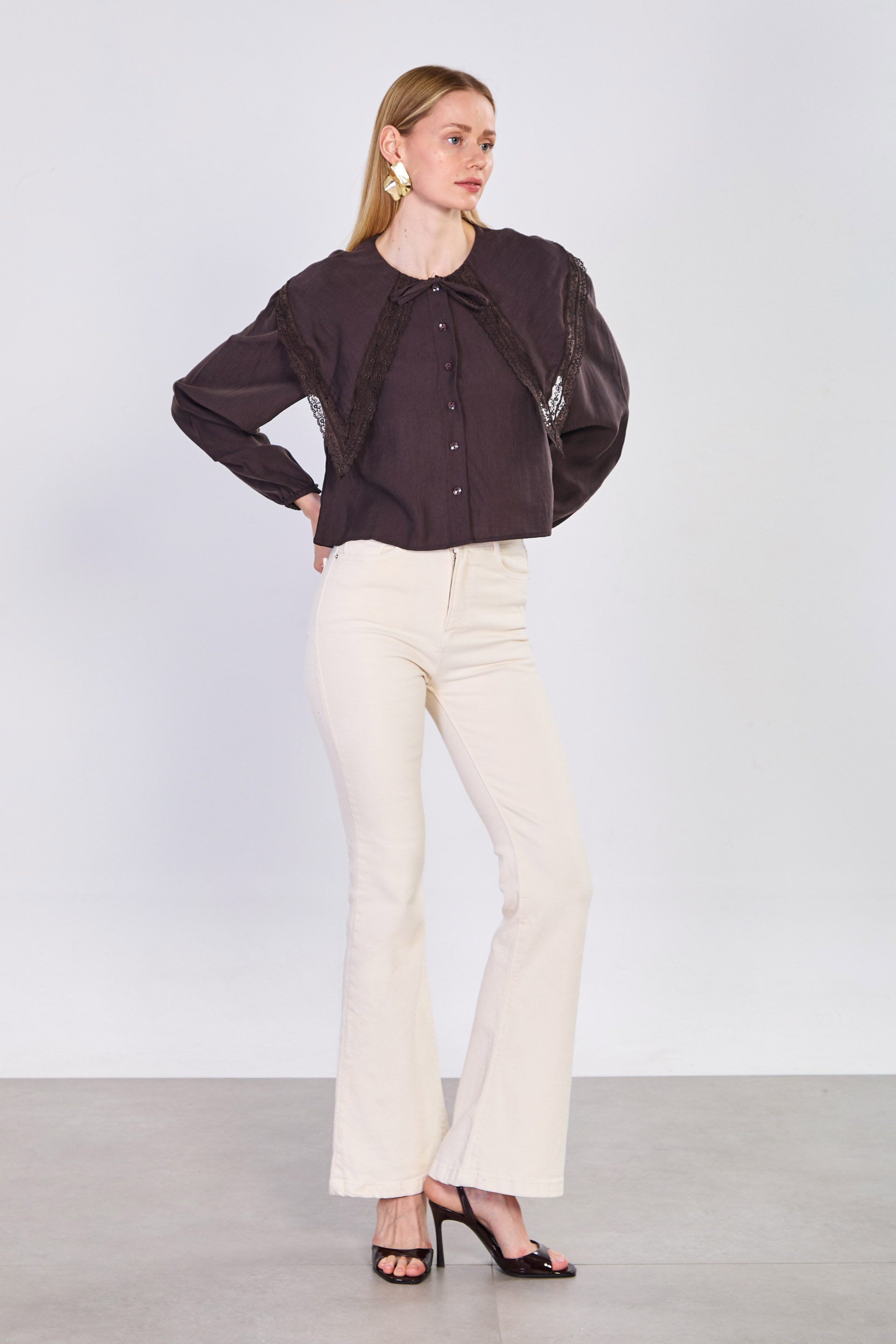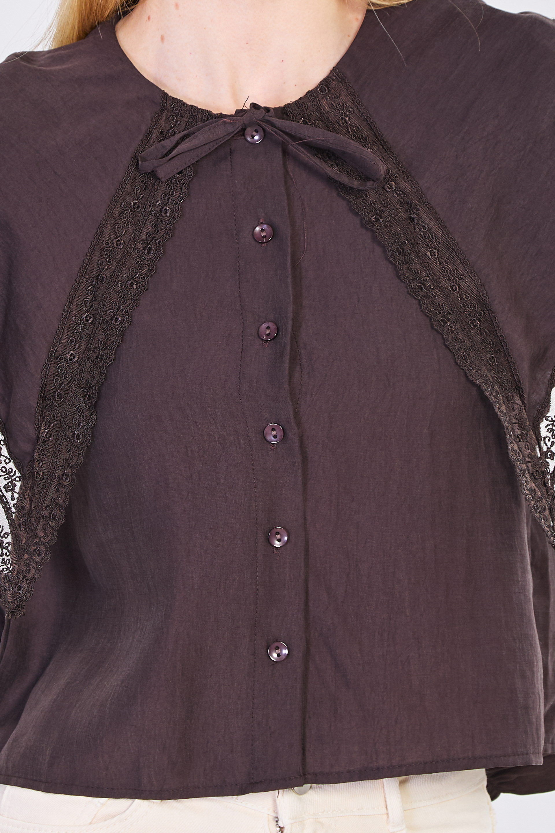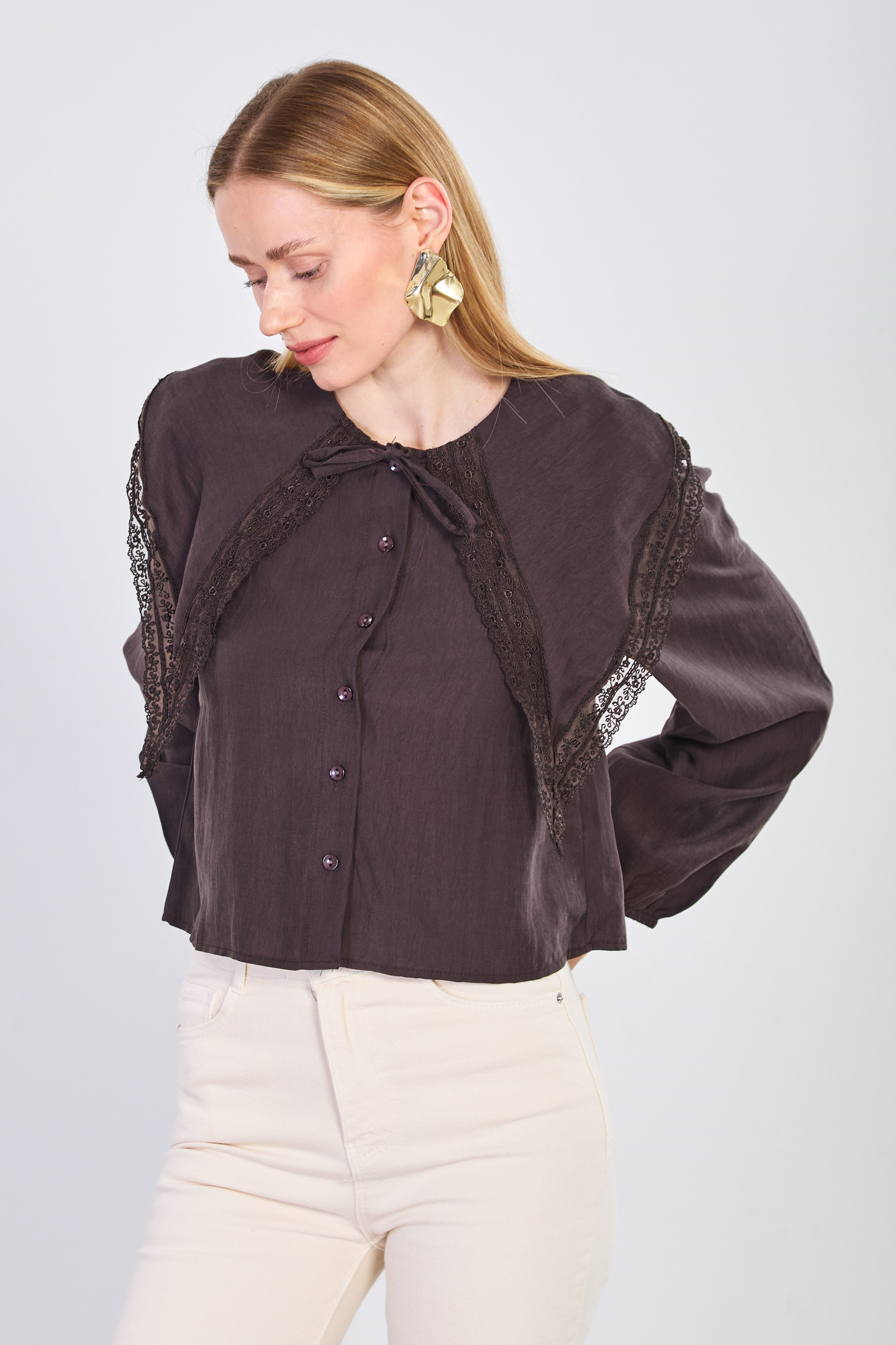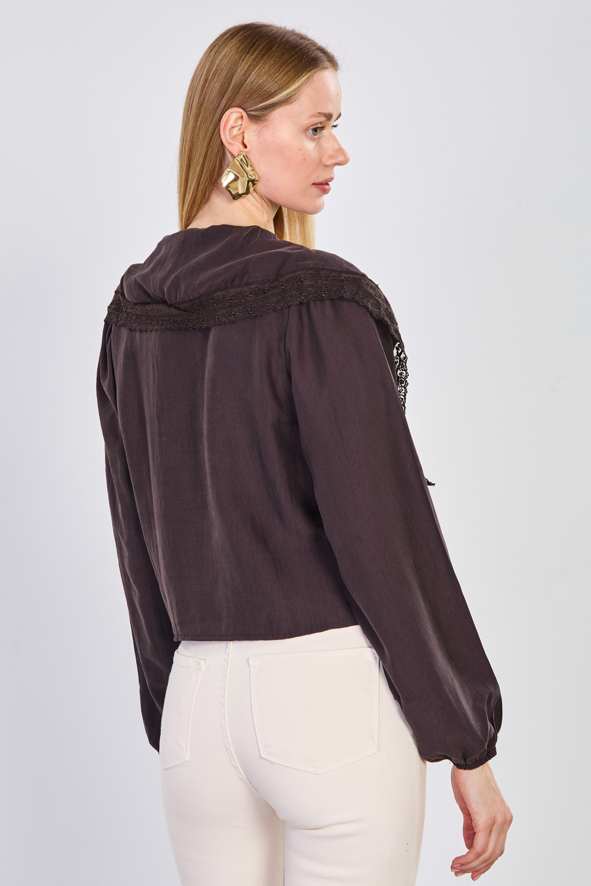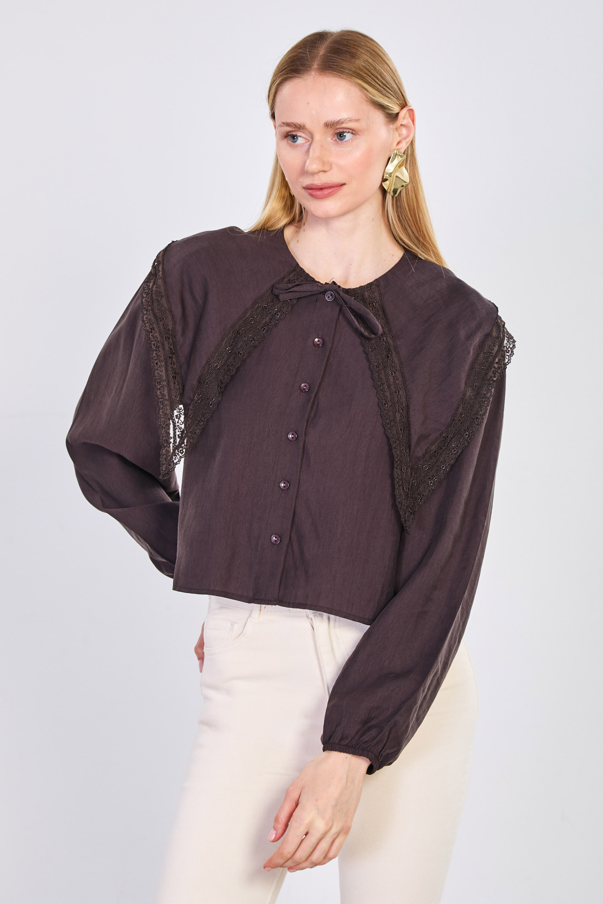 Kadın Yaka Dantelli Gömlek - Acı Kahve