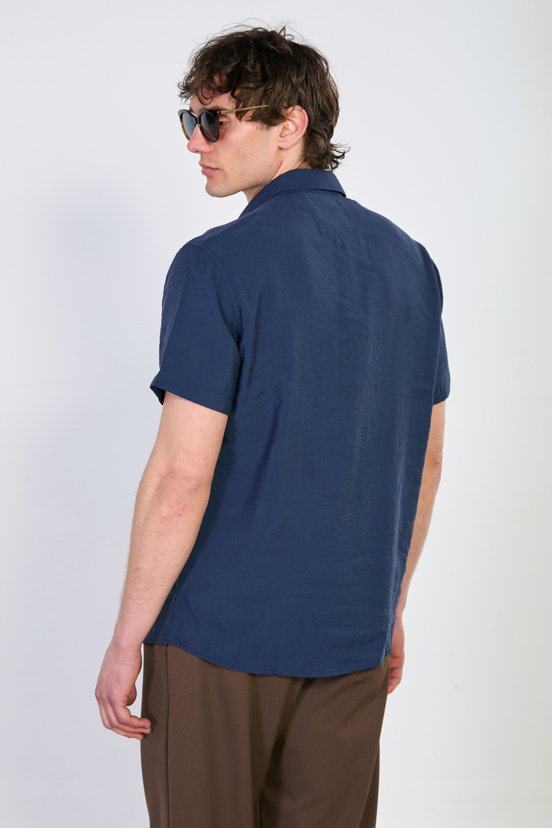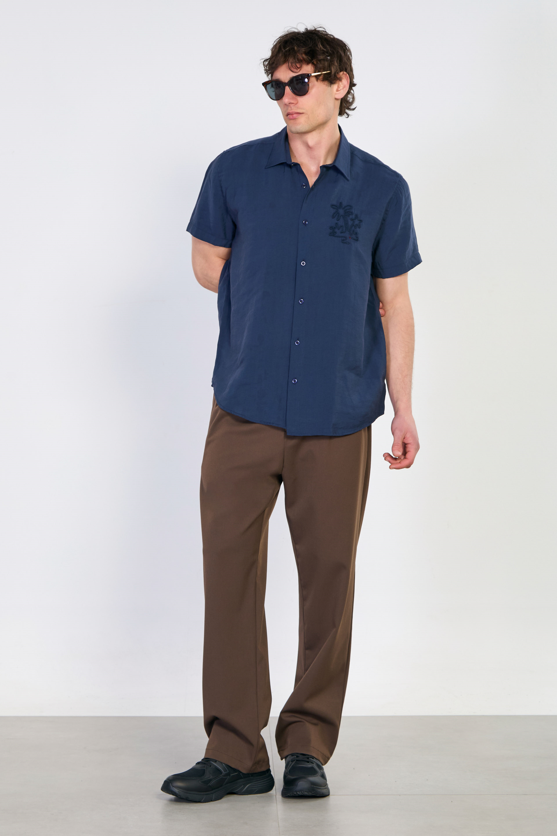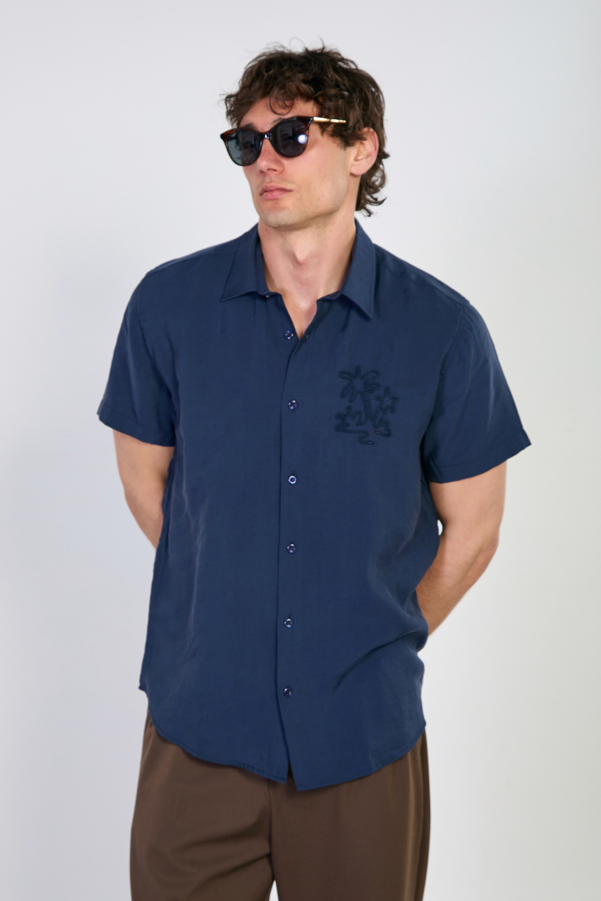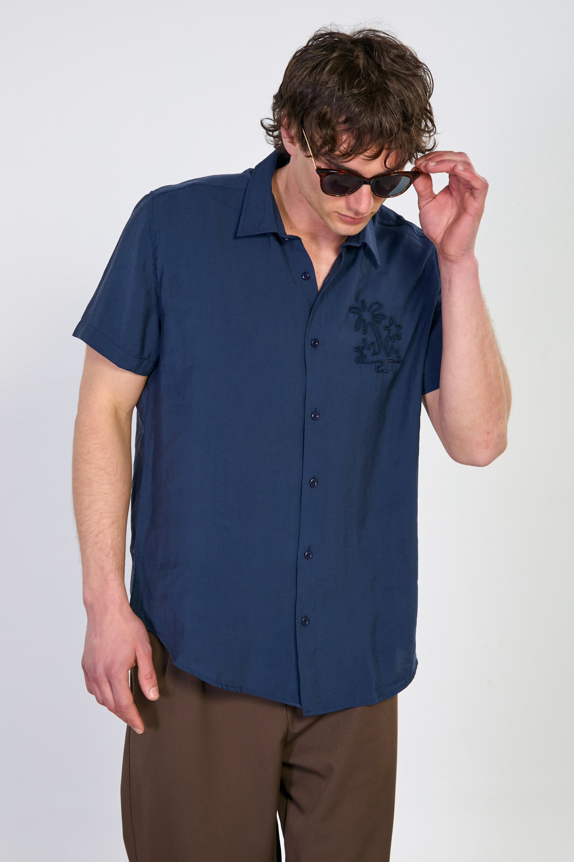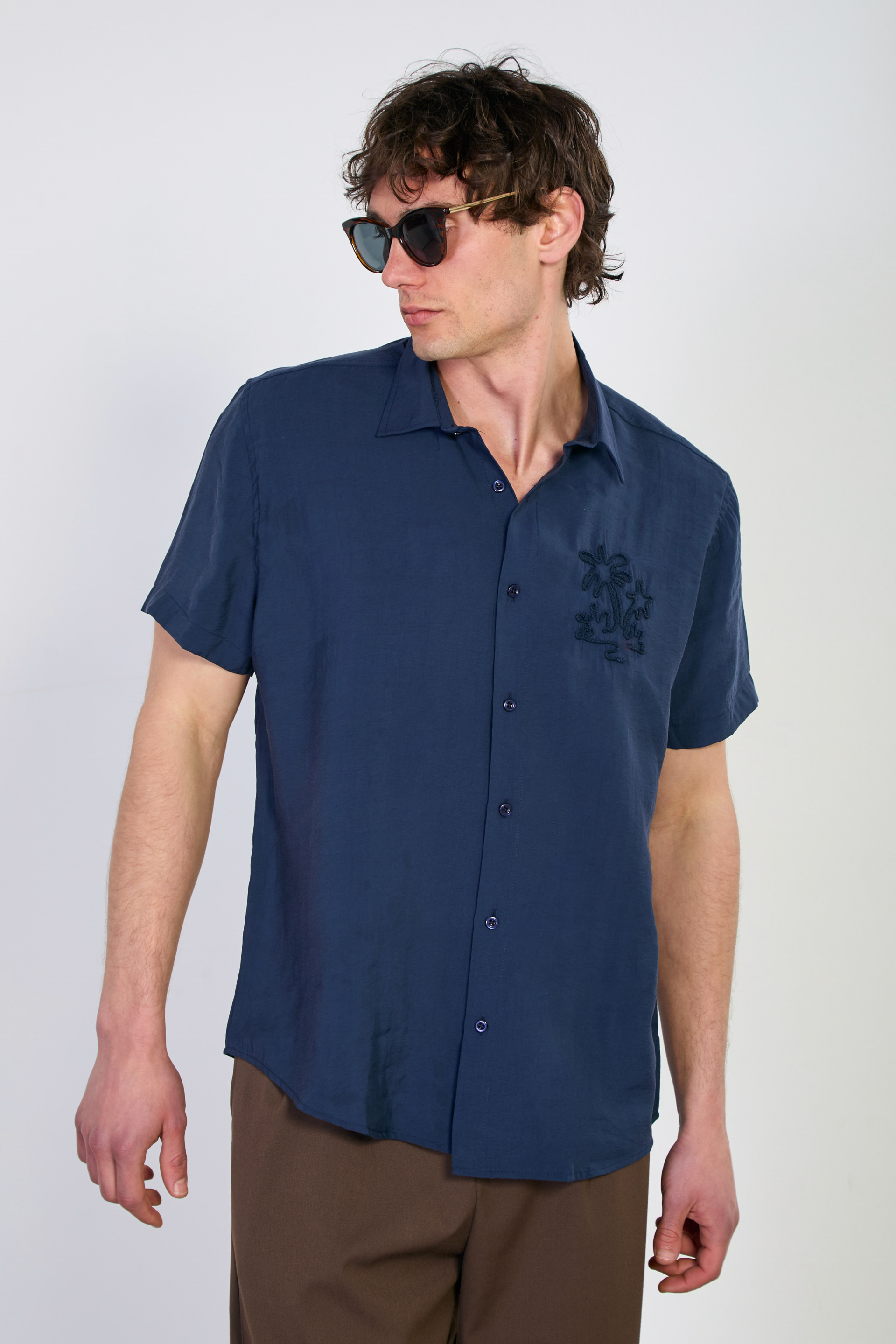 Erkek Yaka İşlemeli Kısa Kollu Gömlek - Lacivert