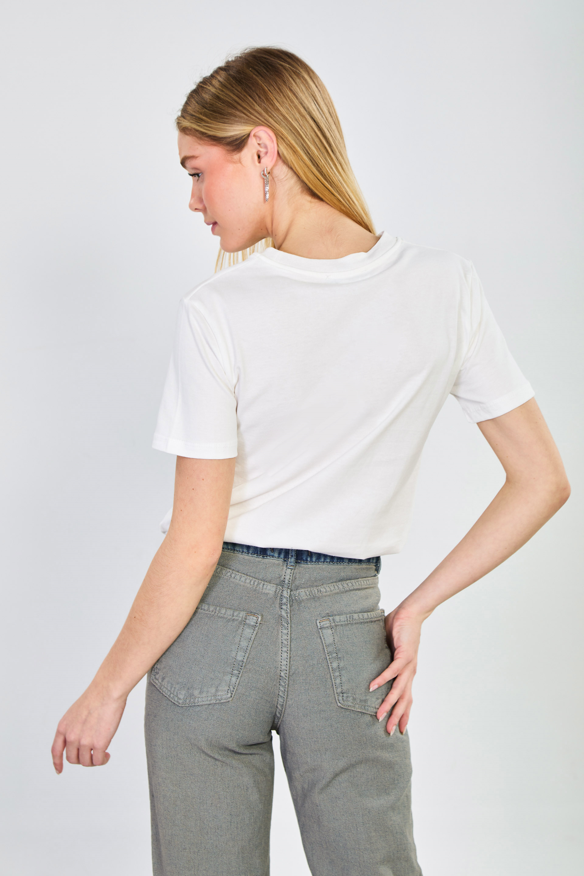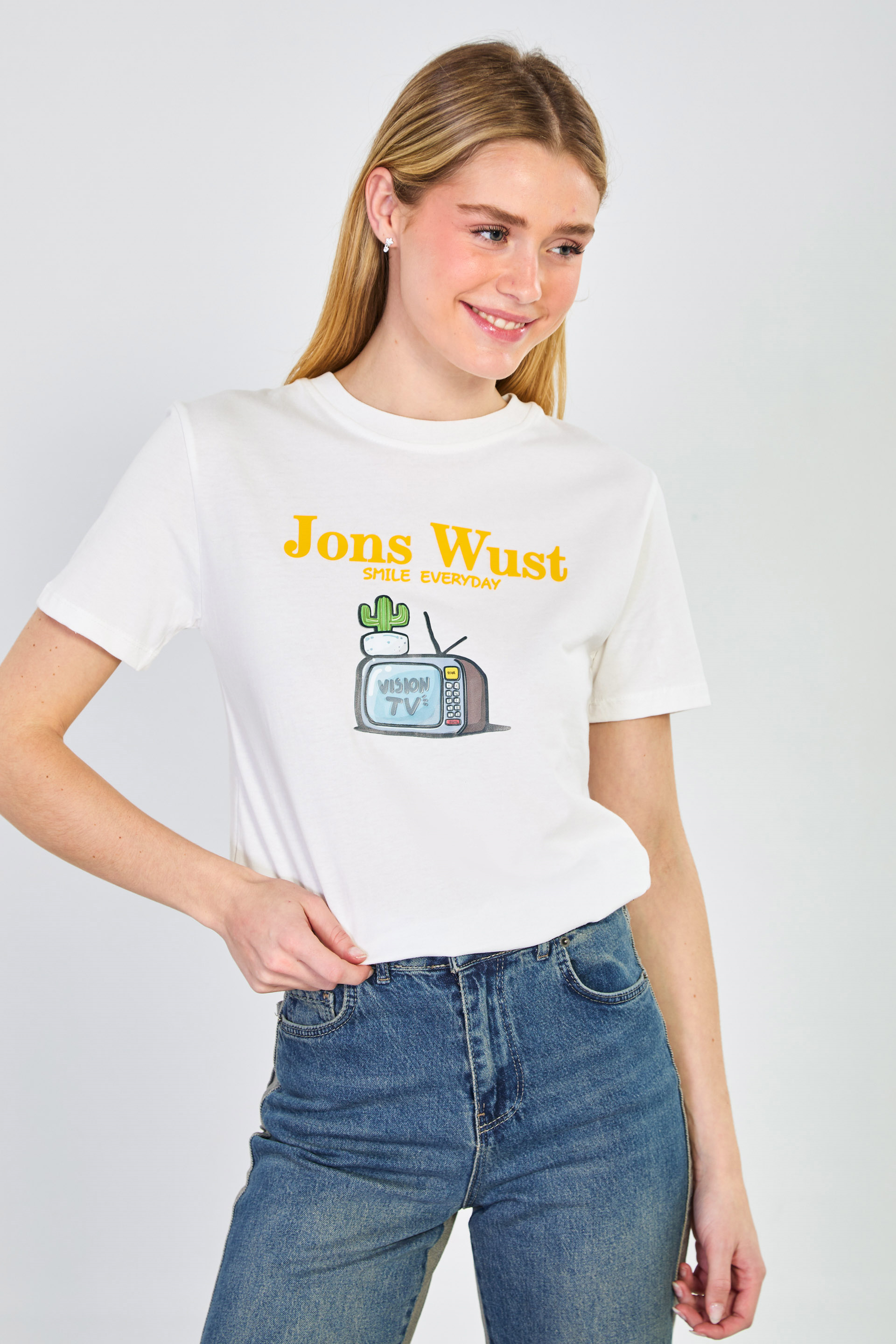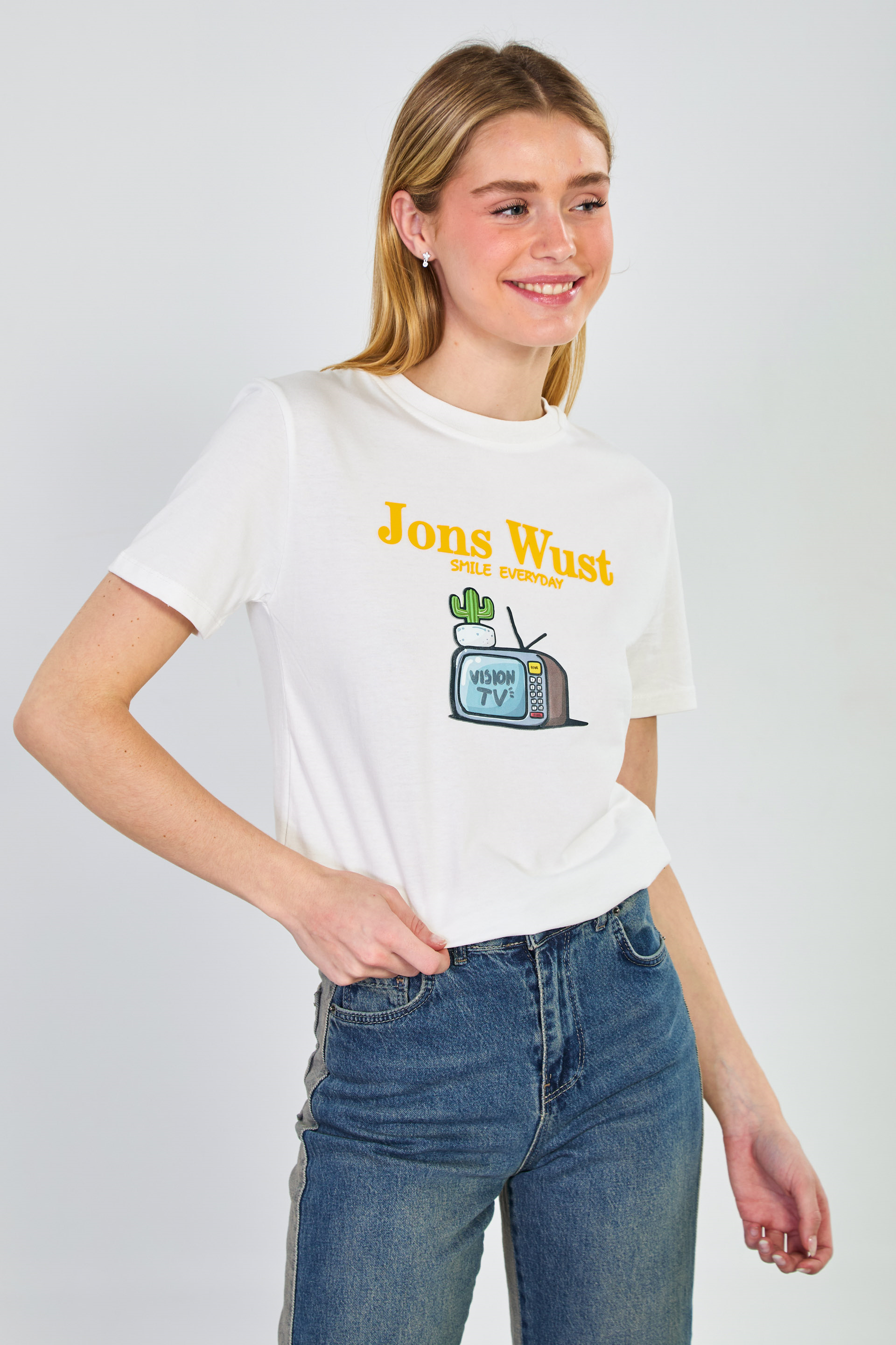 Kadın Yaka Kontrastlı Vision Tv Baskılı T-Shirt - Ekru