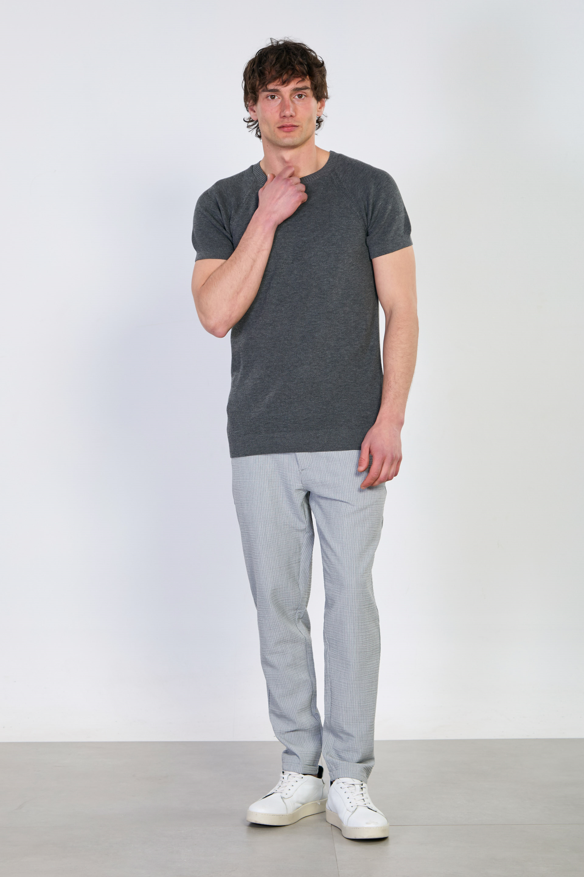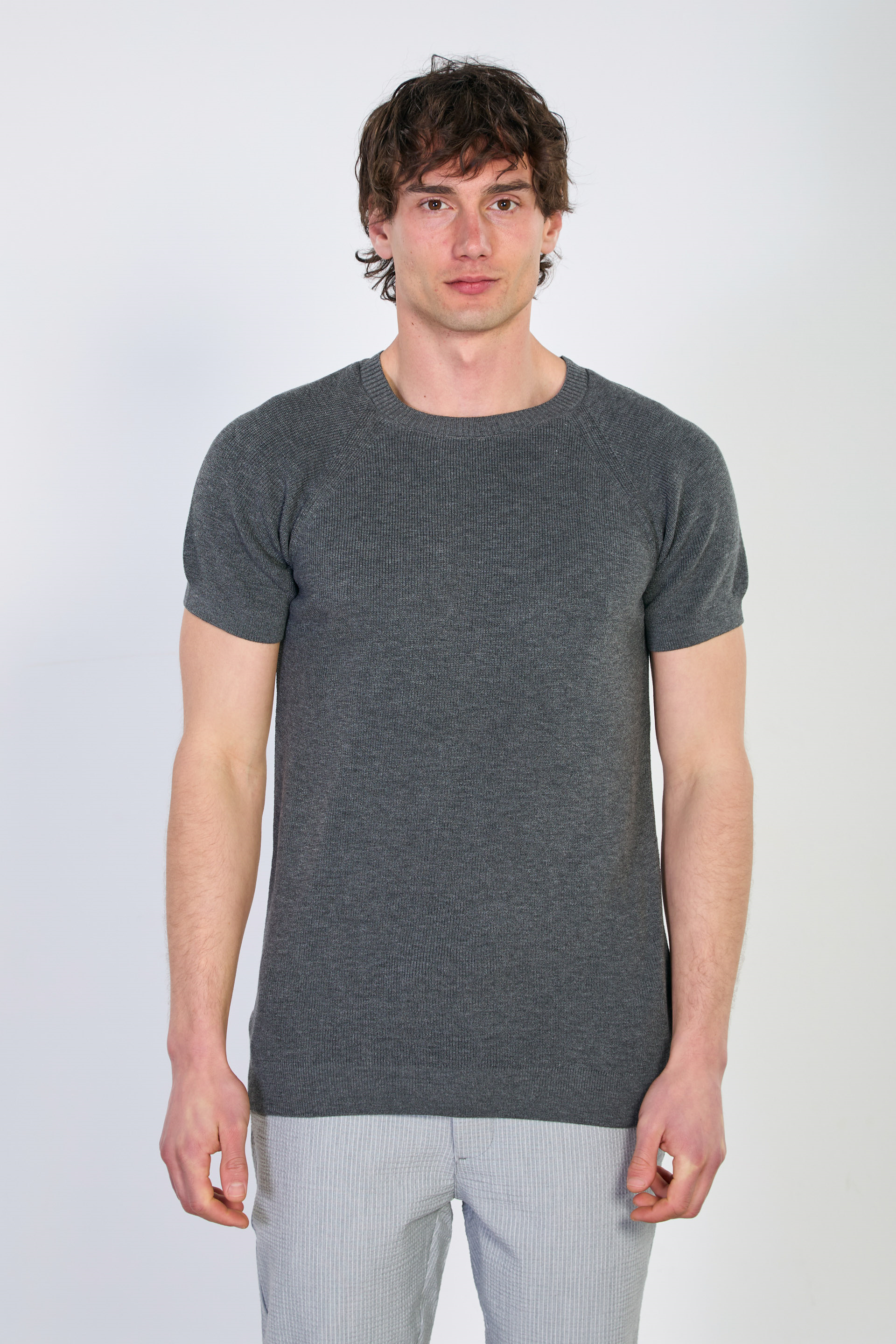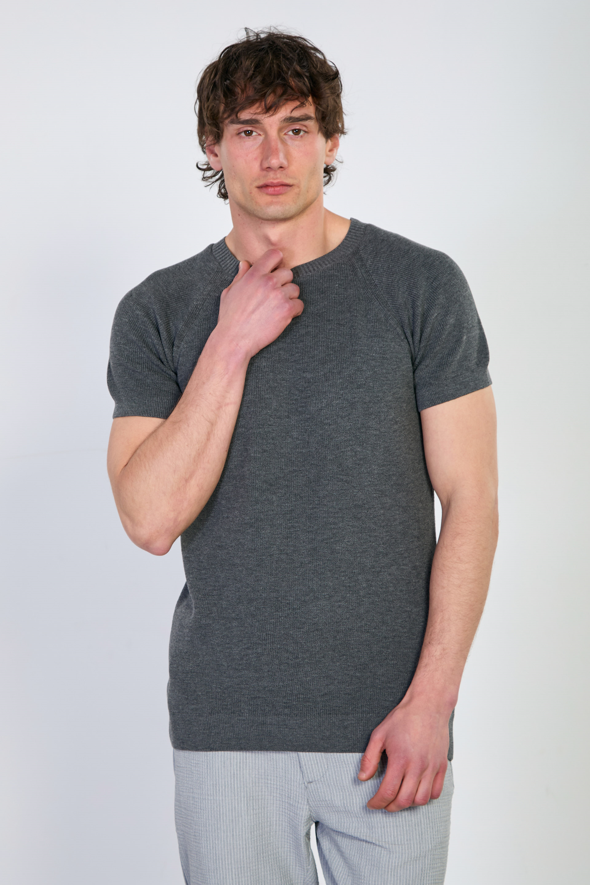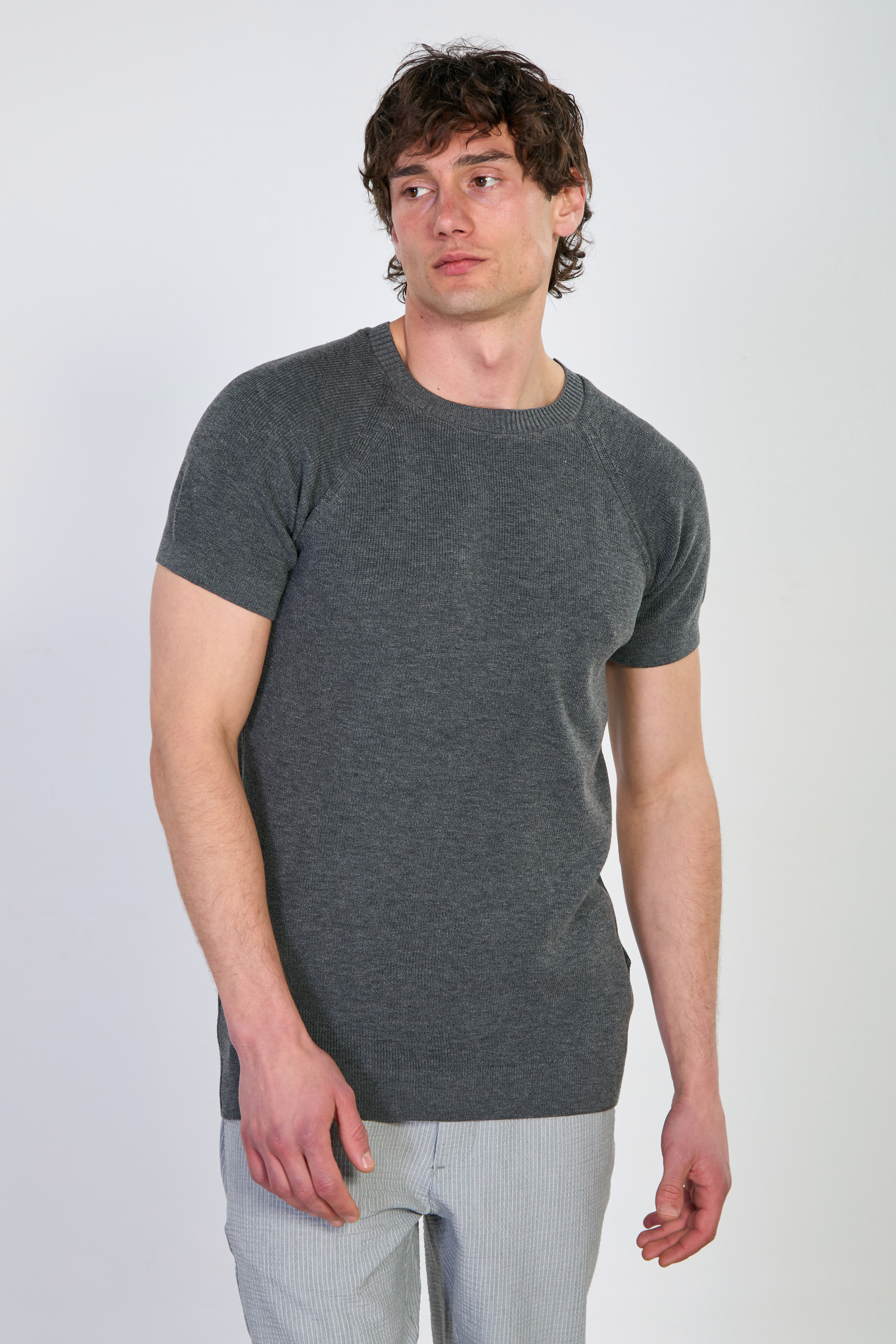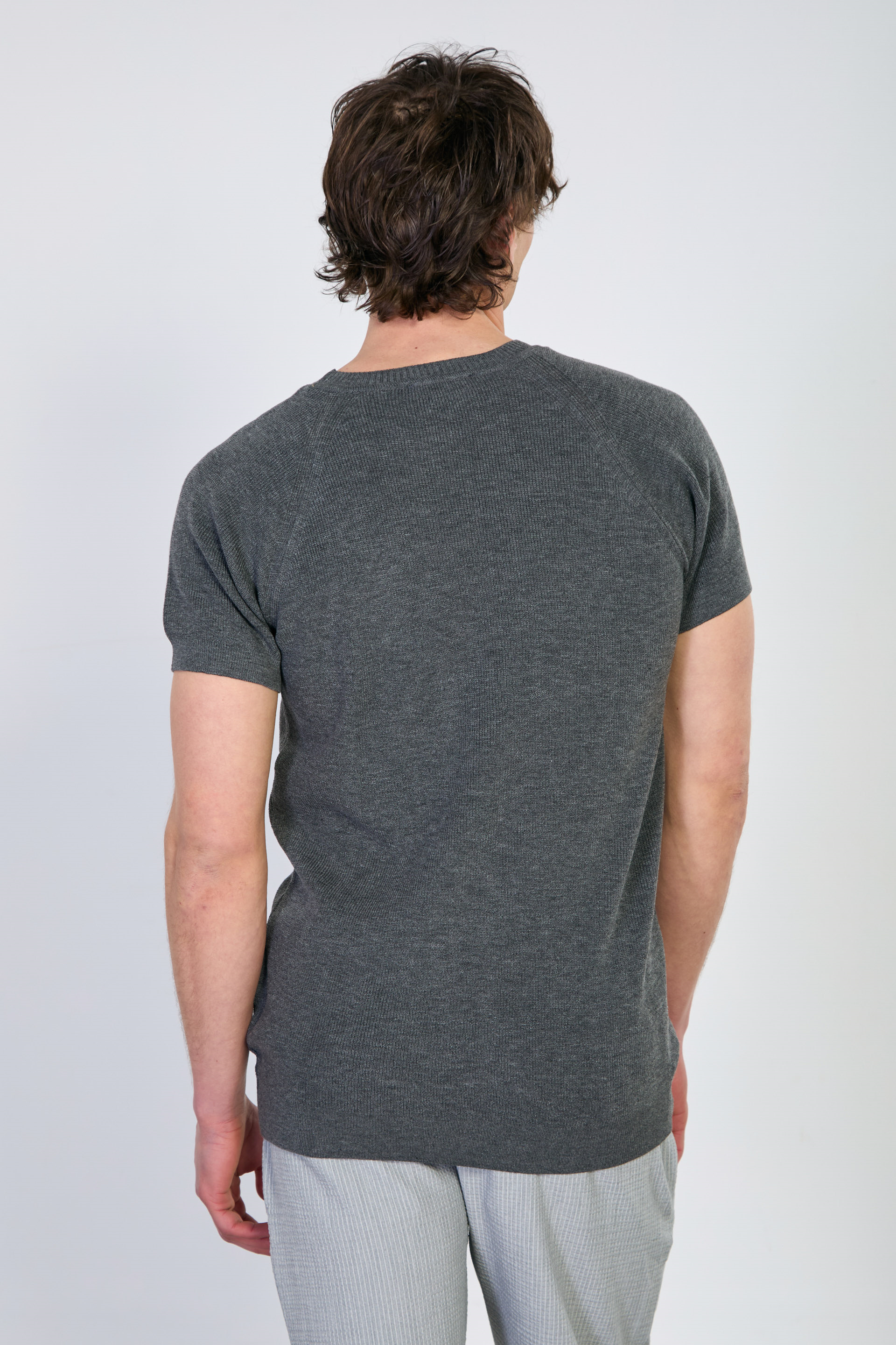 Erkek Yaka Ribanalı Triko T-Shirt - Antrasit