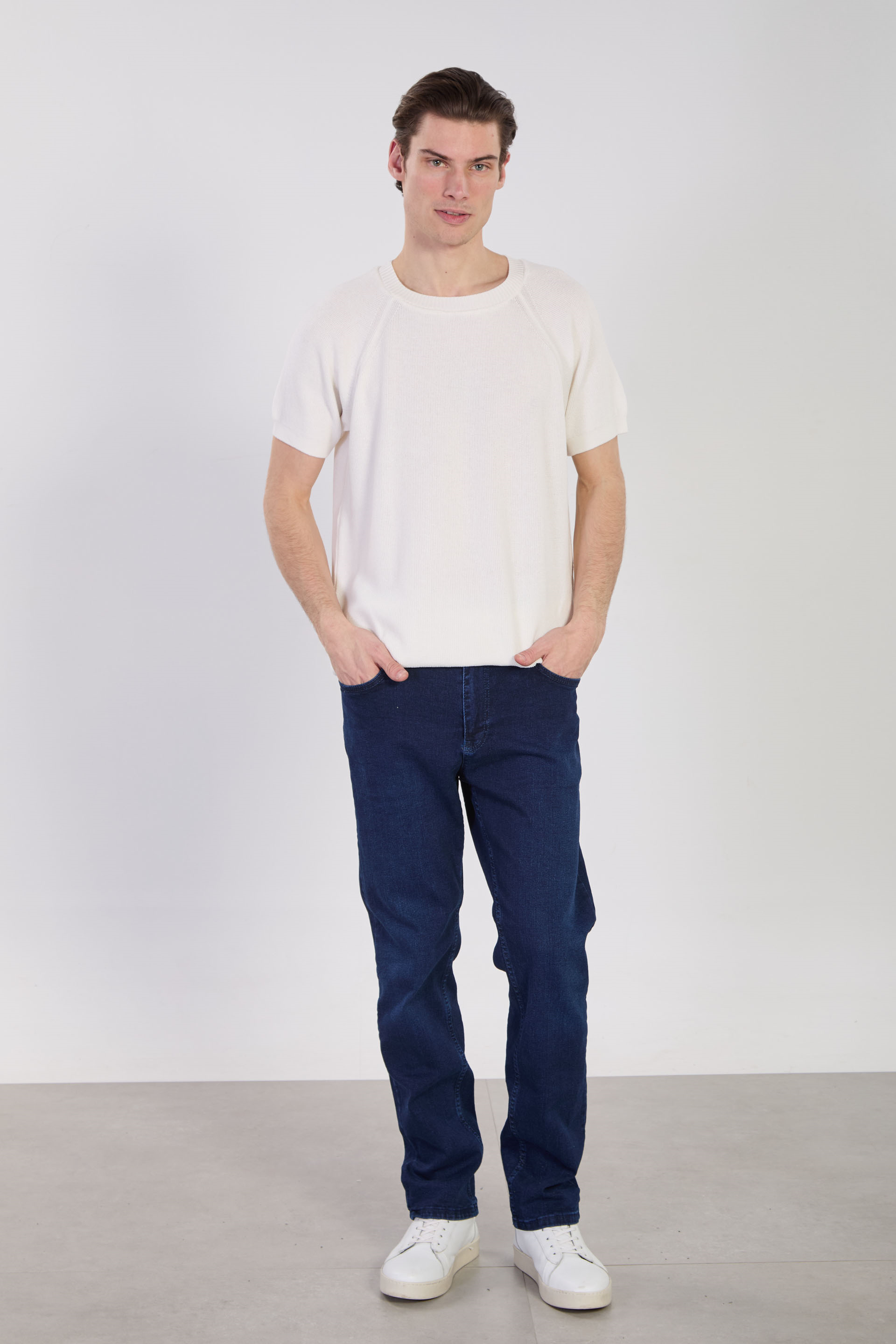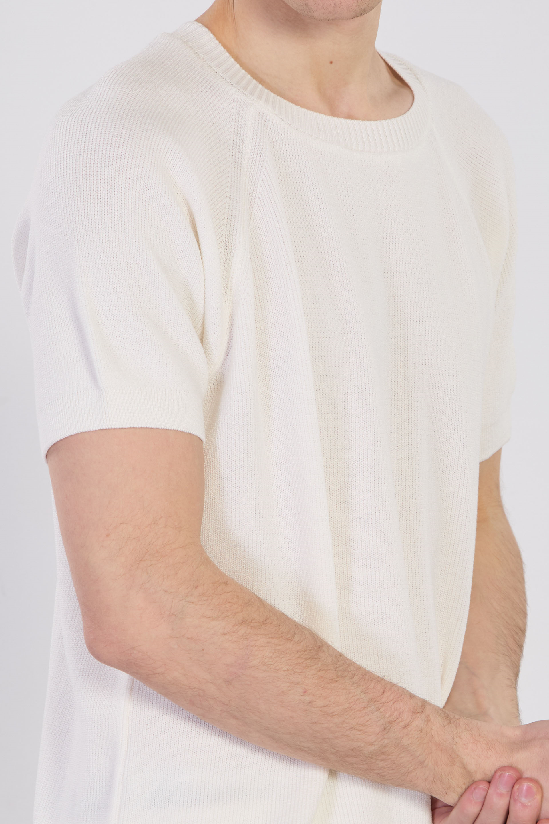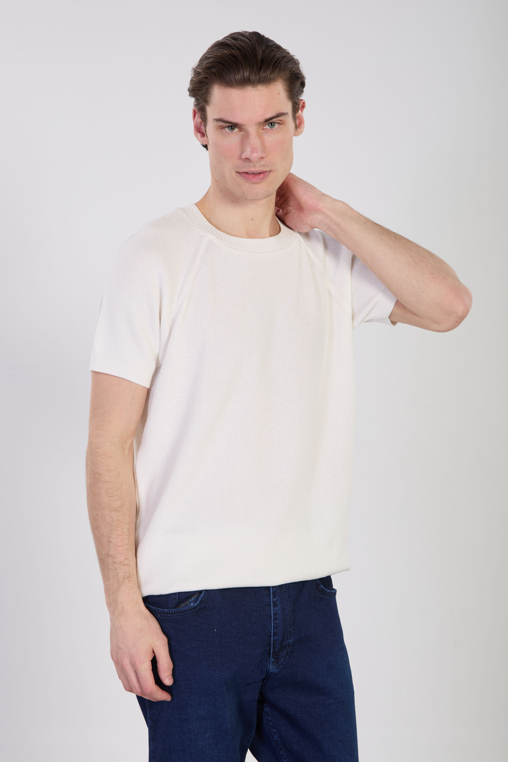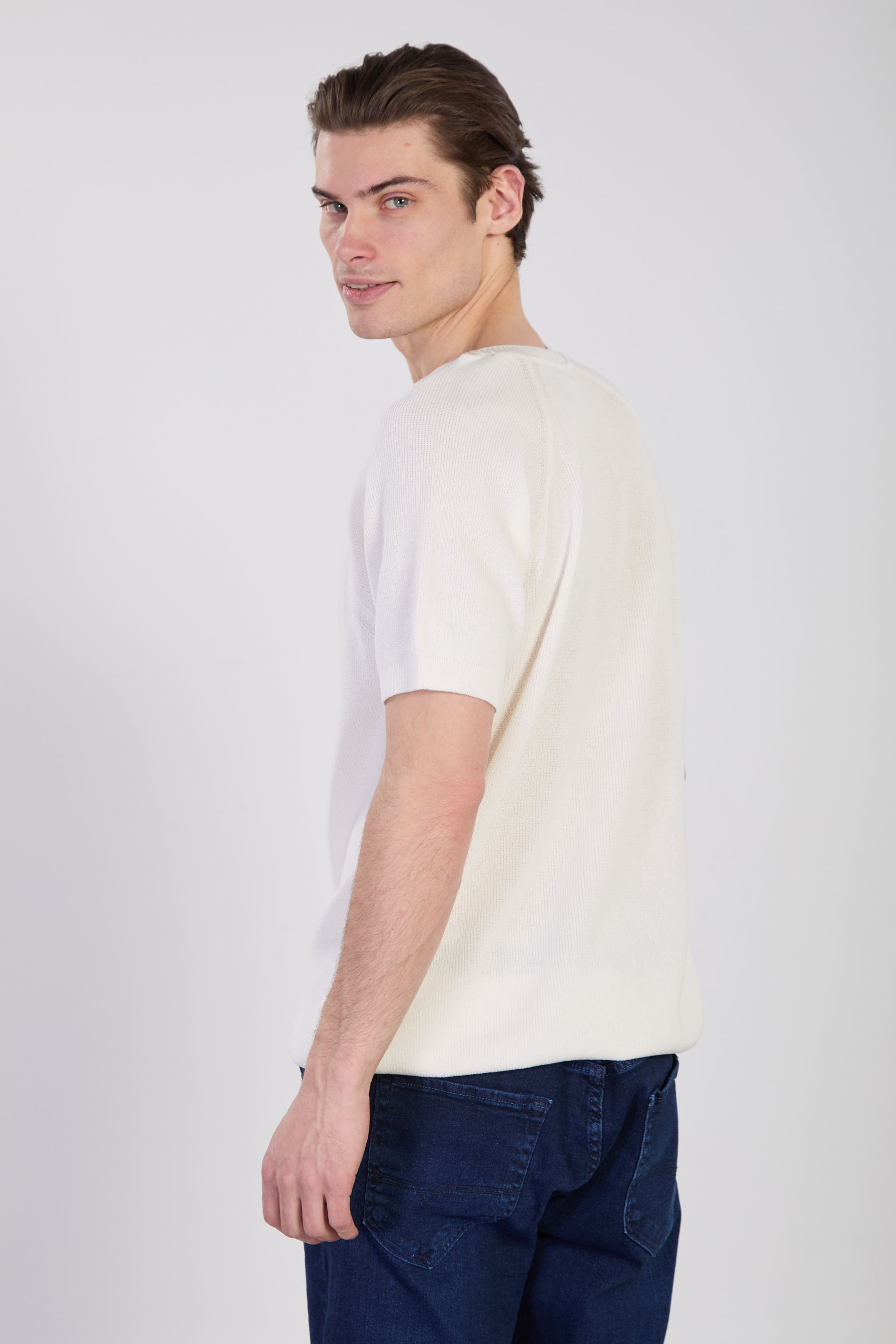 Erkek Yaka Ribanalı Triko T-Shirt - Ekru