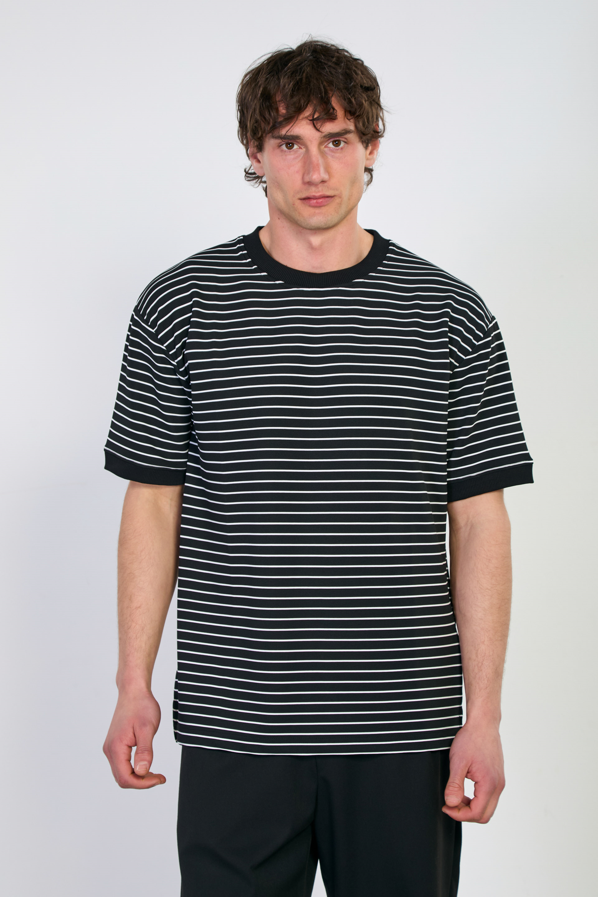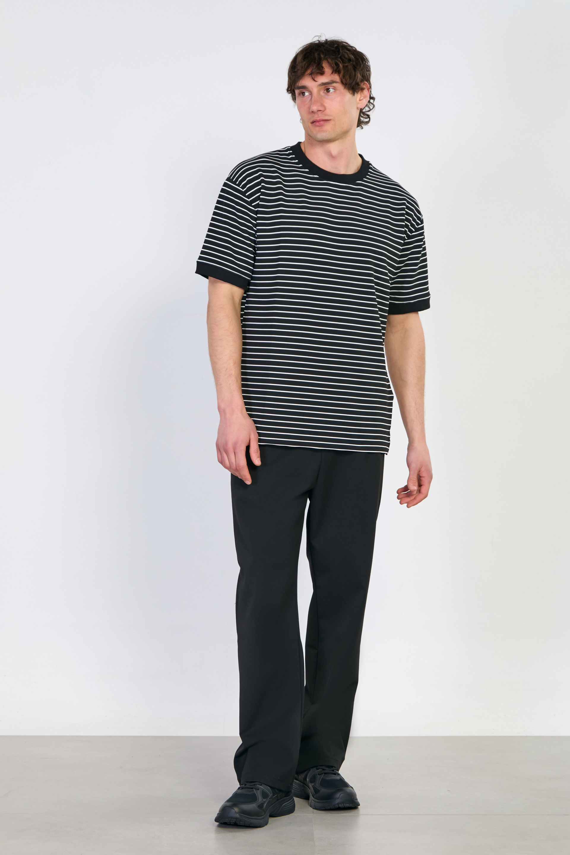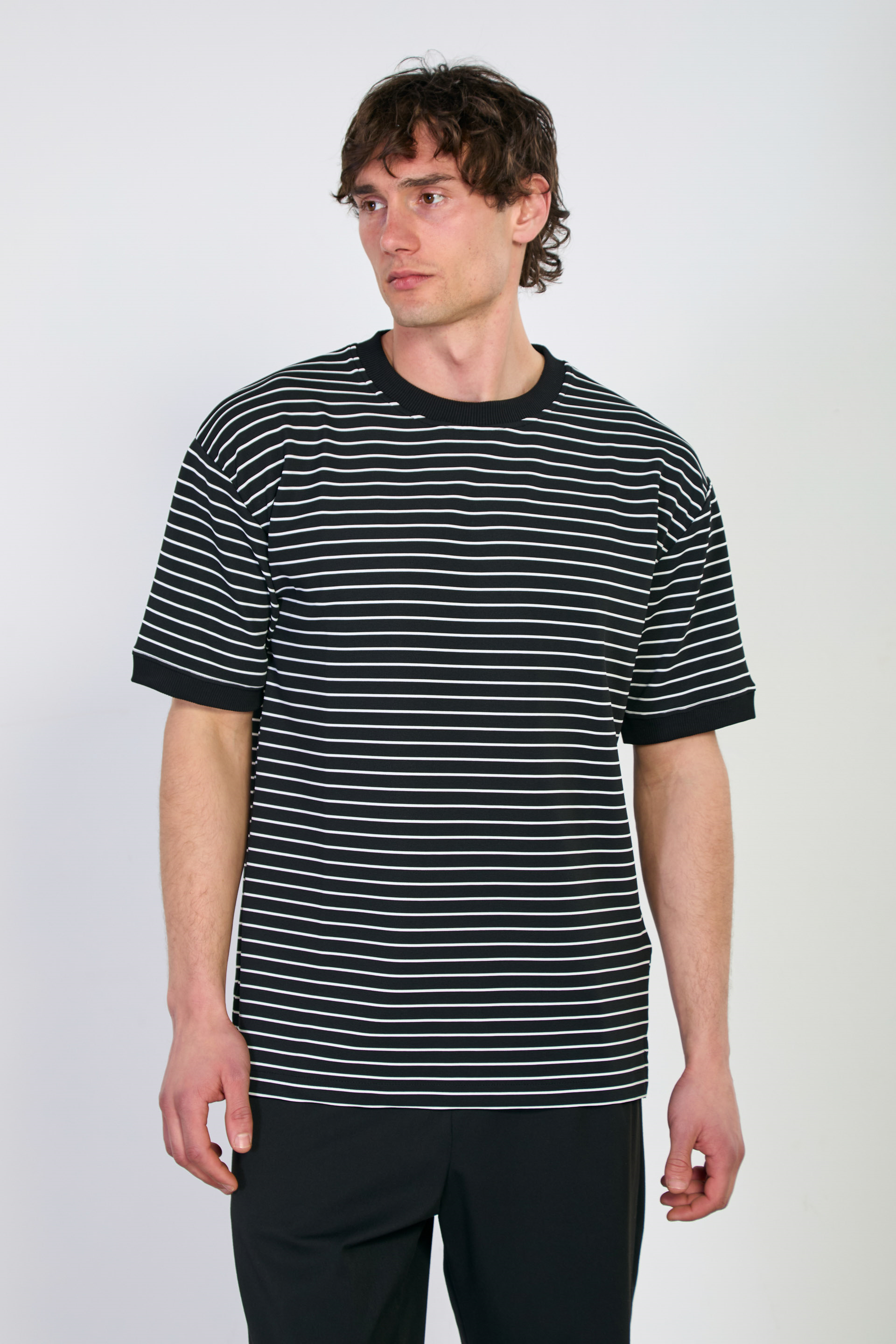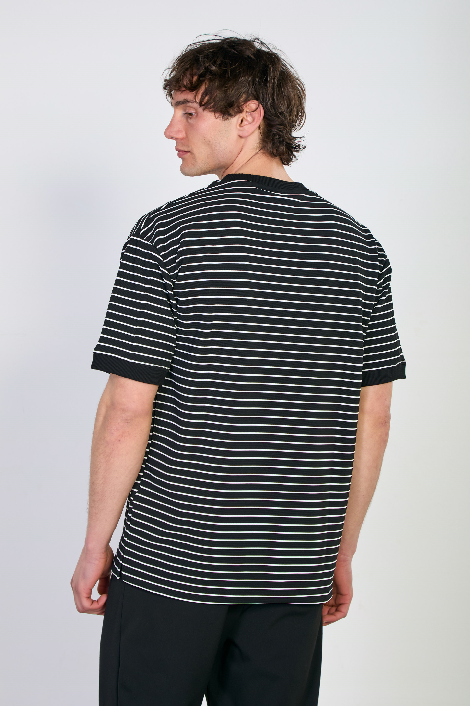 Erkek Yakası ve Kolları Ribanalı Çizgili T-Shirt - Siyah