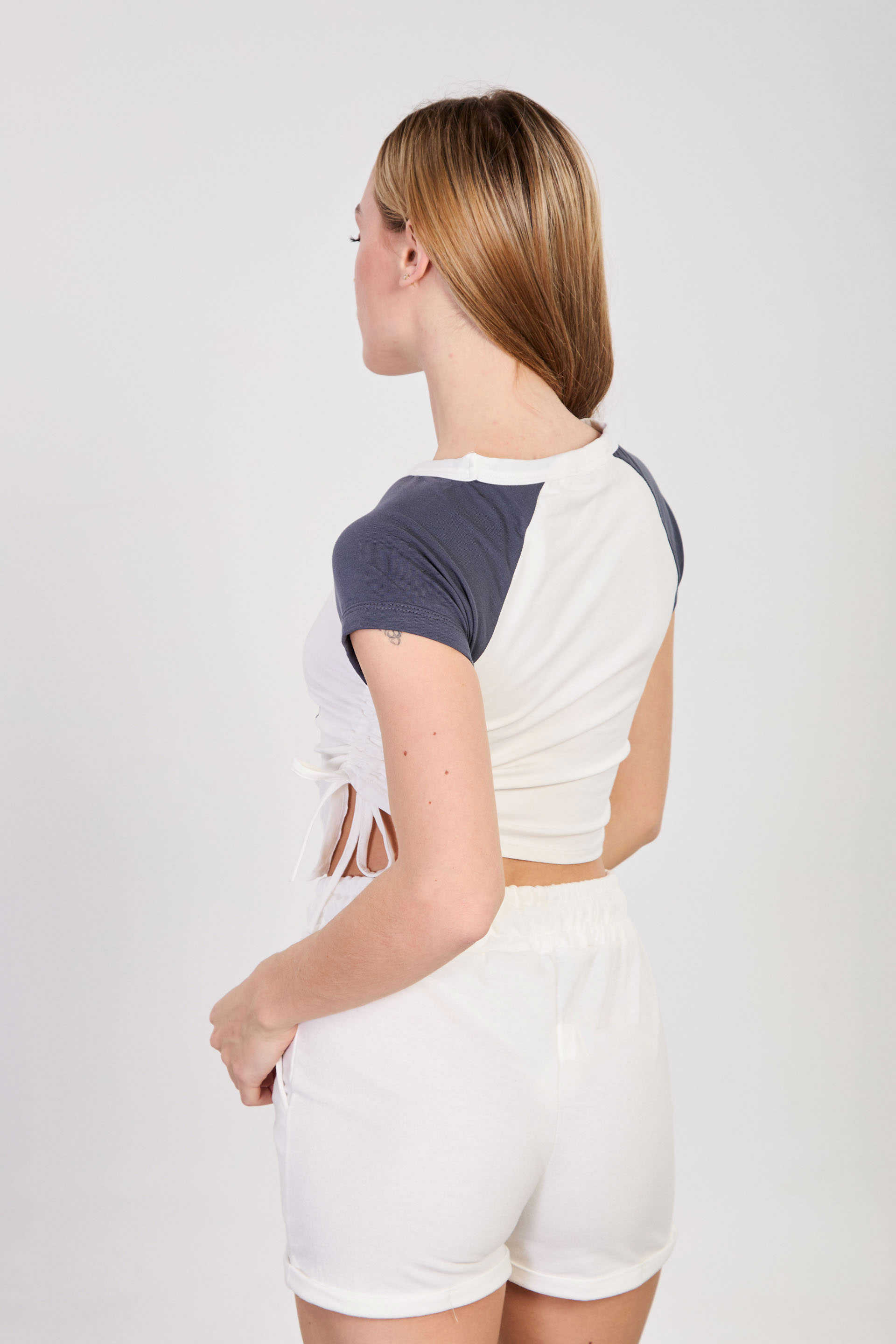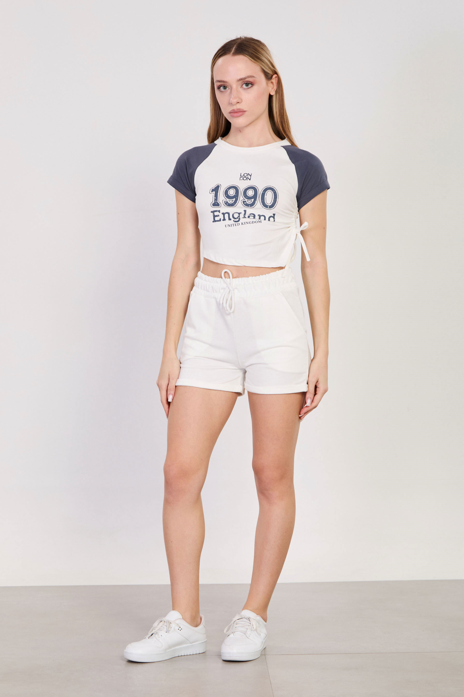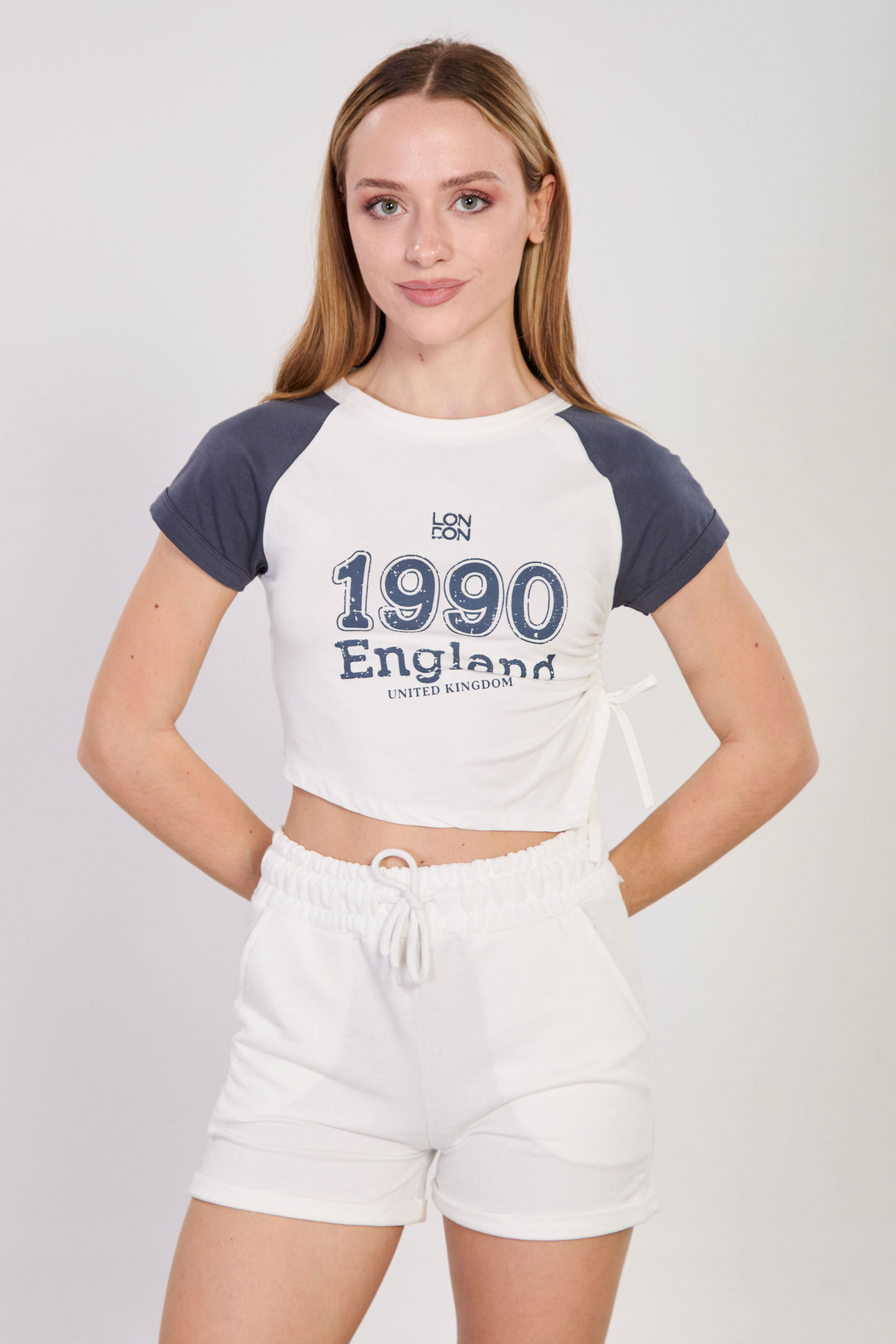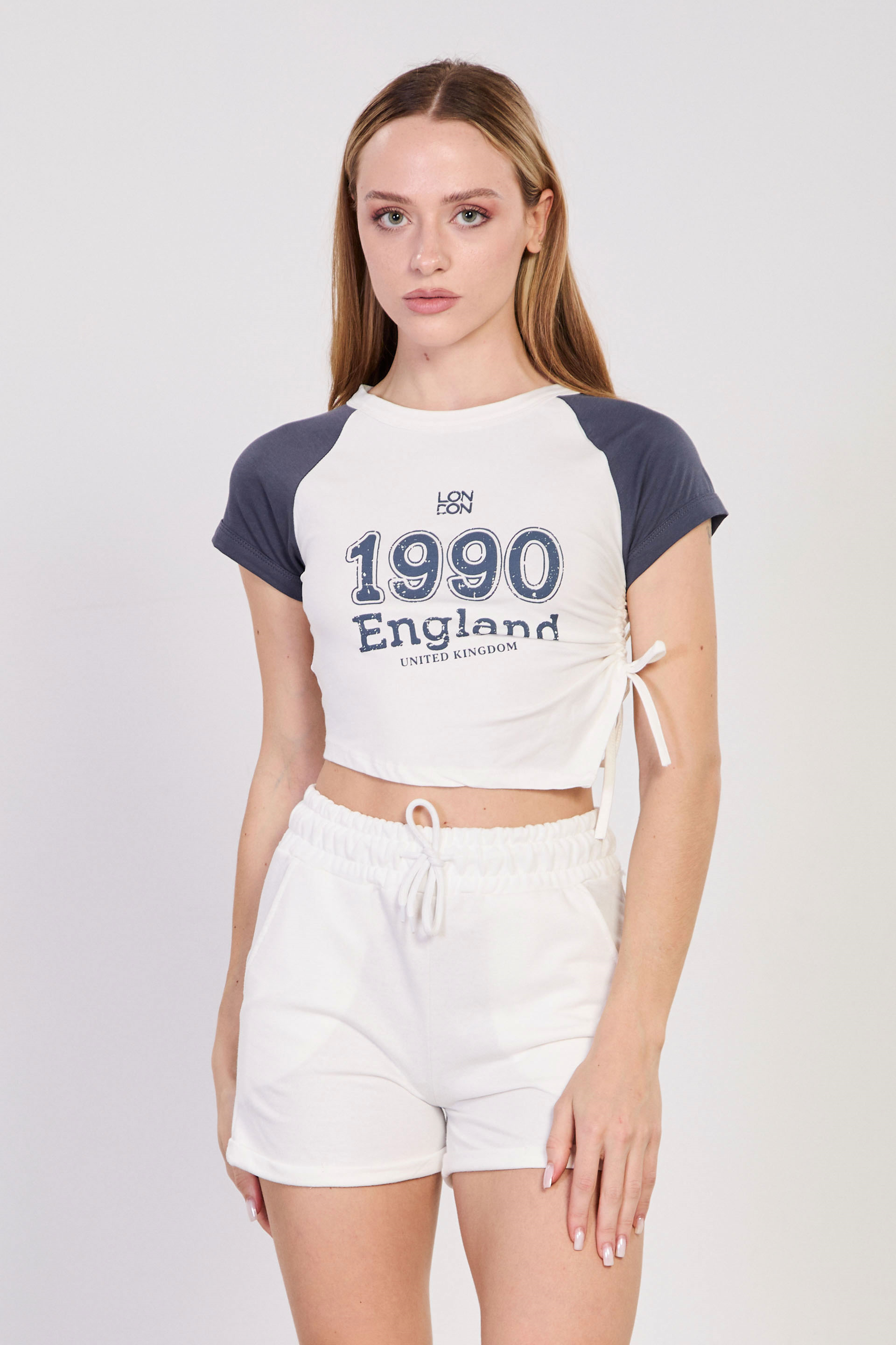 Kadın Yanı Büzgülü Önü Baskılı Reglan Kol T-Shirt - Ekru/Antrasit