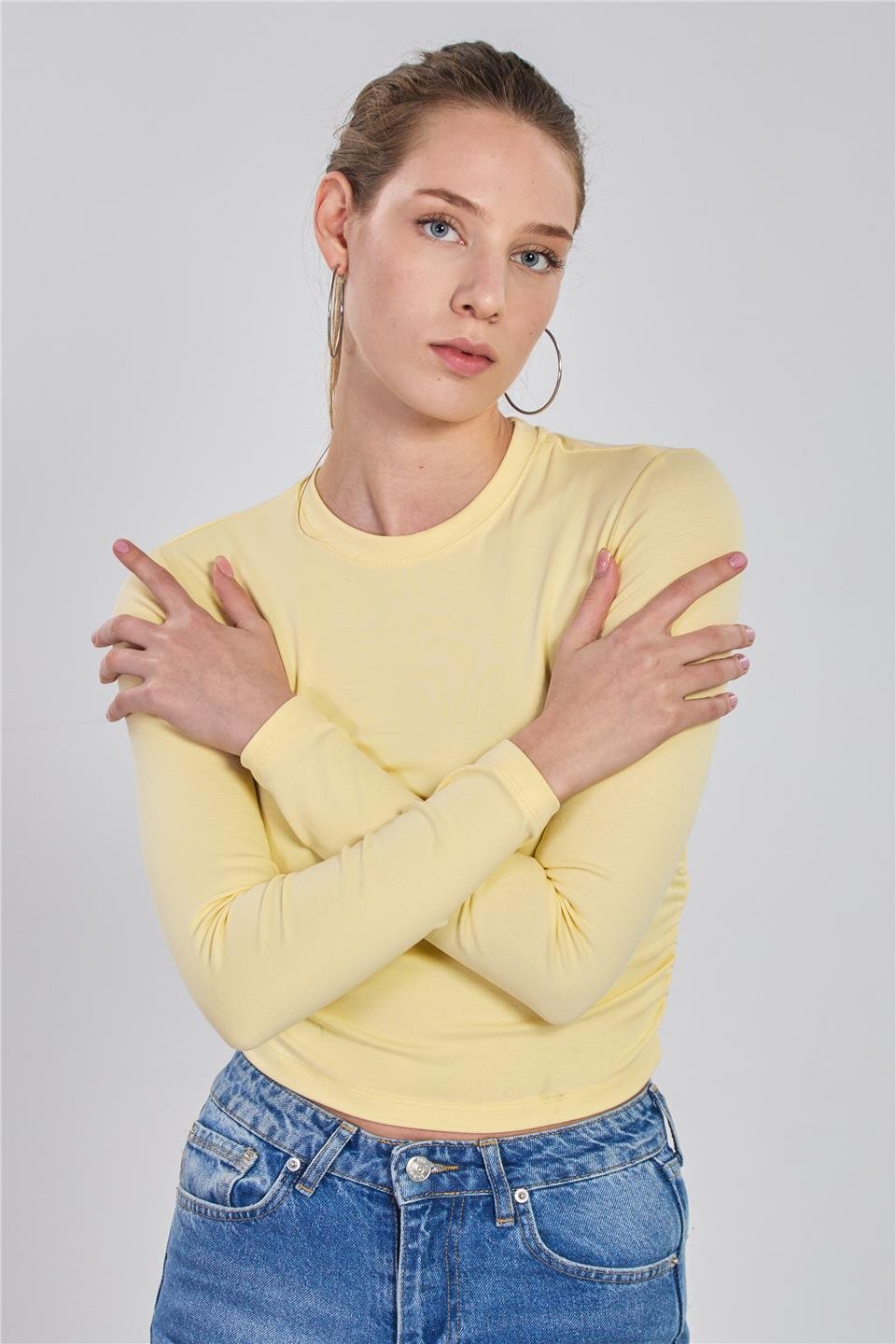 Kadın Yanı Büzgülü Uzun Kol Body - Açık Sarı