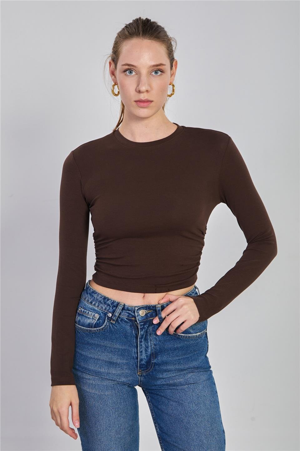 Kadın Yanı Büzgülü Uzun Kol Body - Kahve