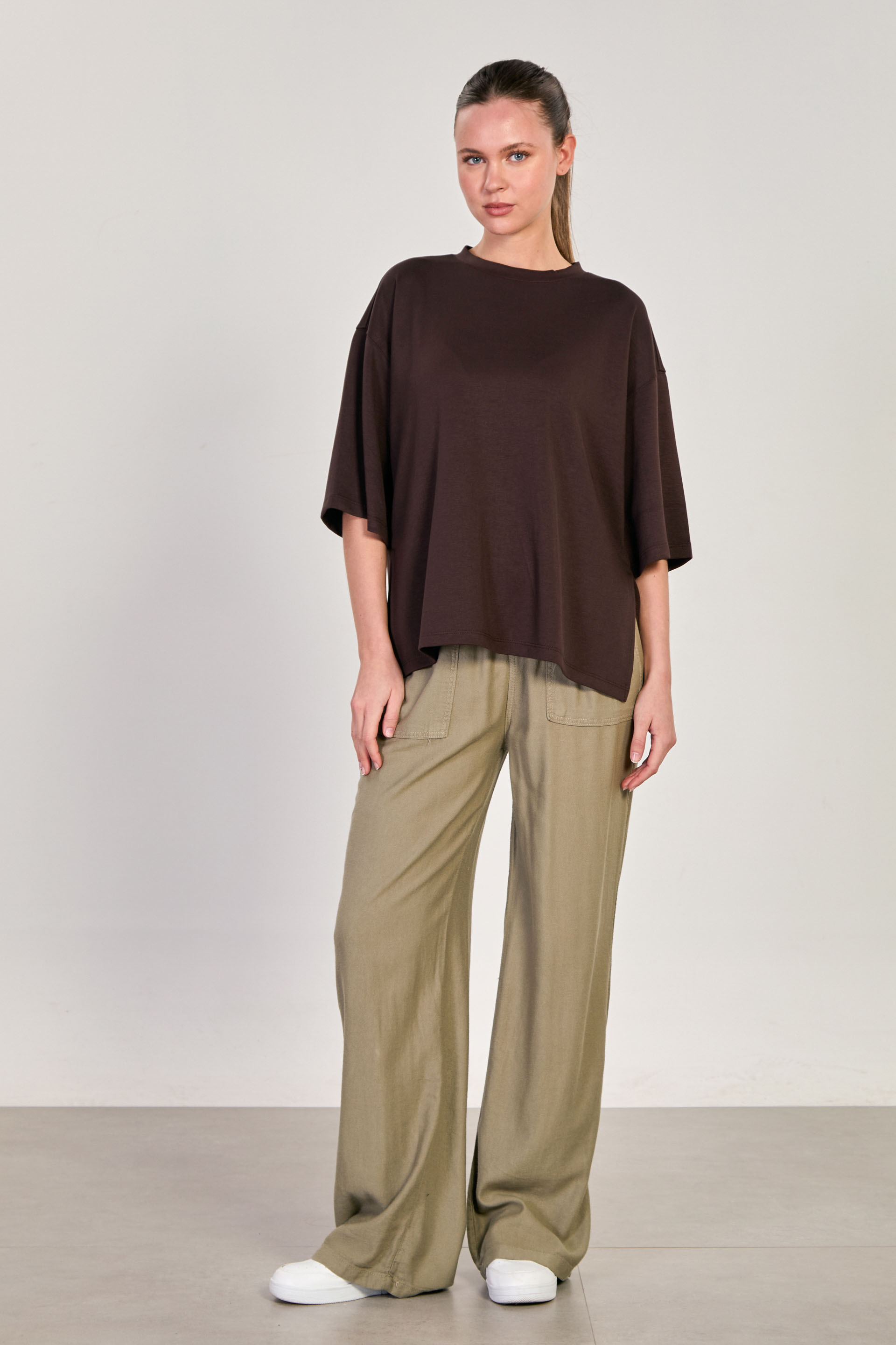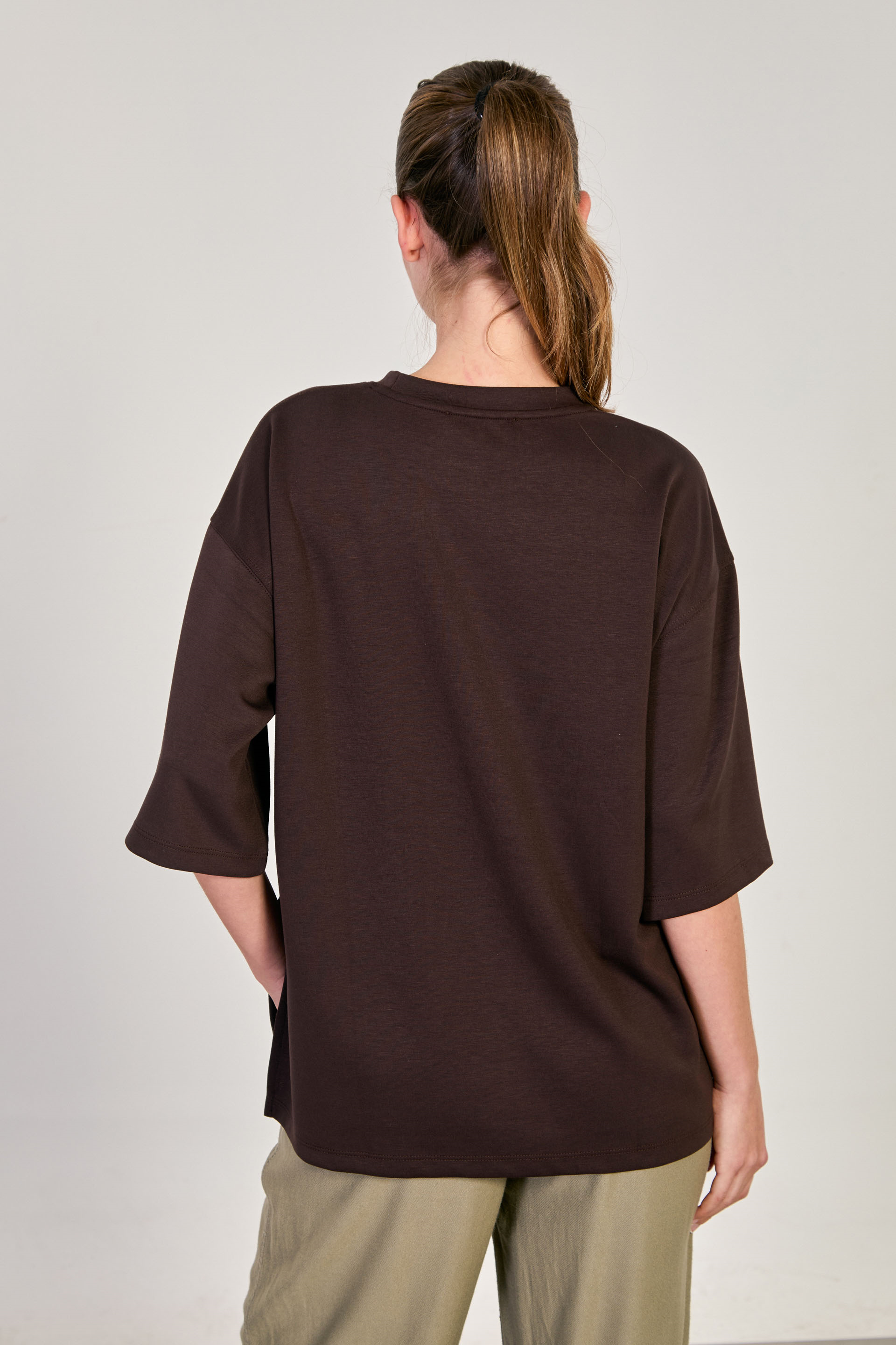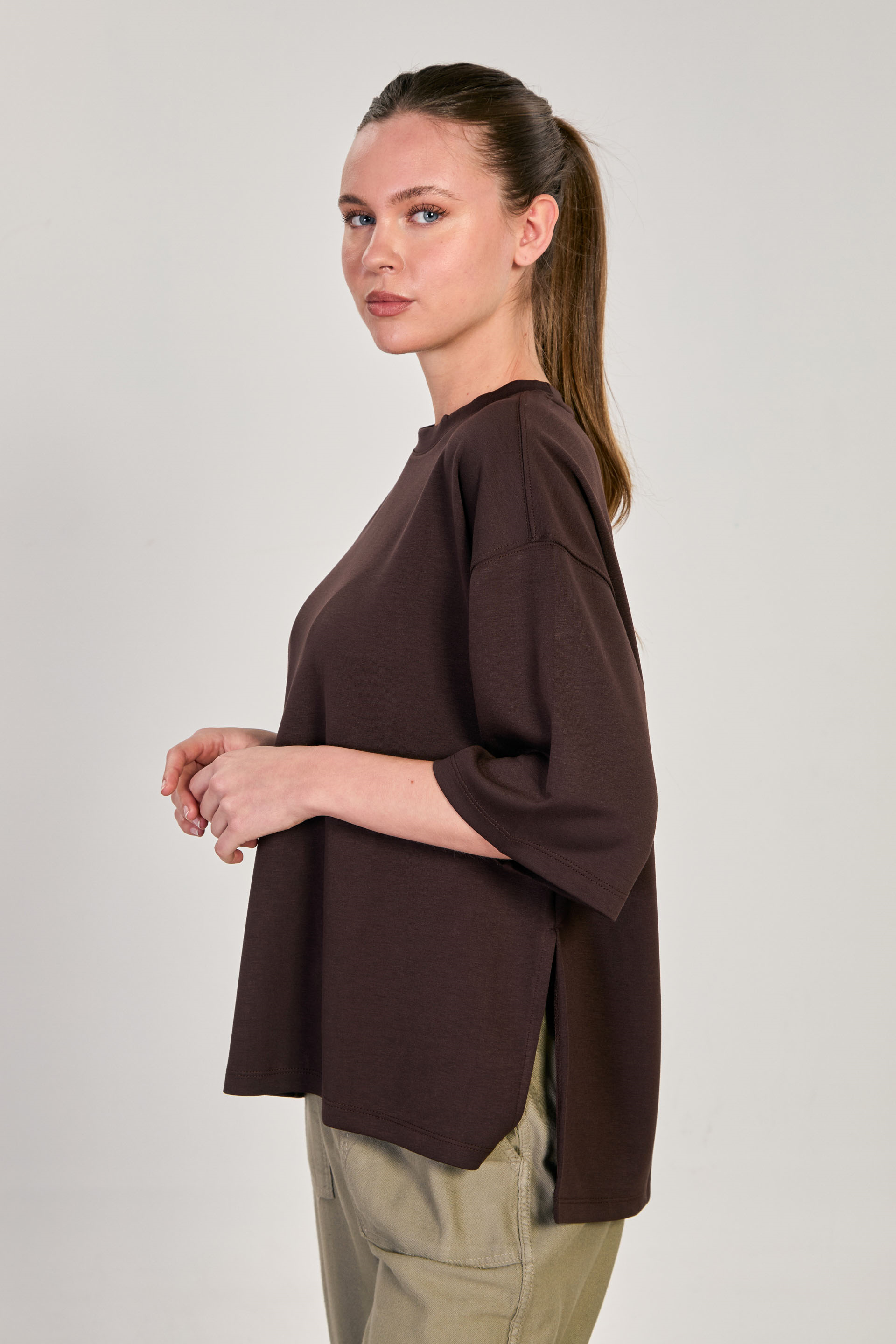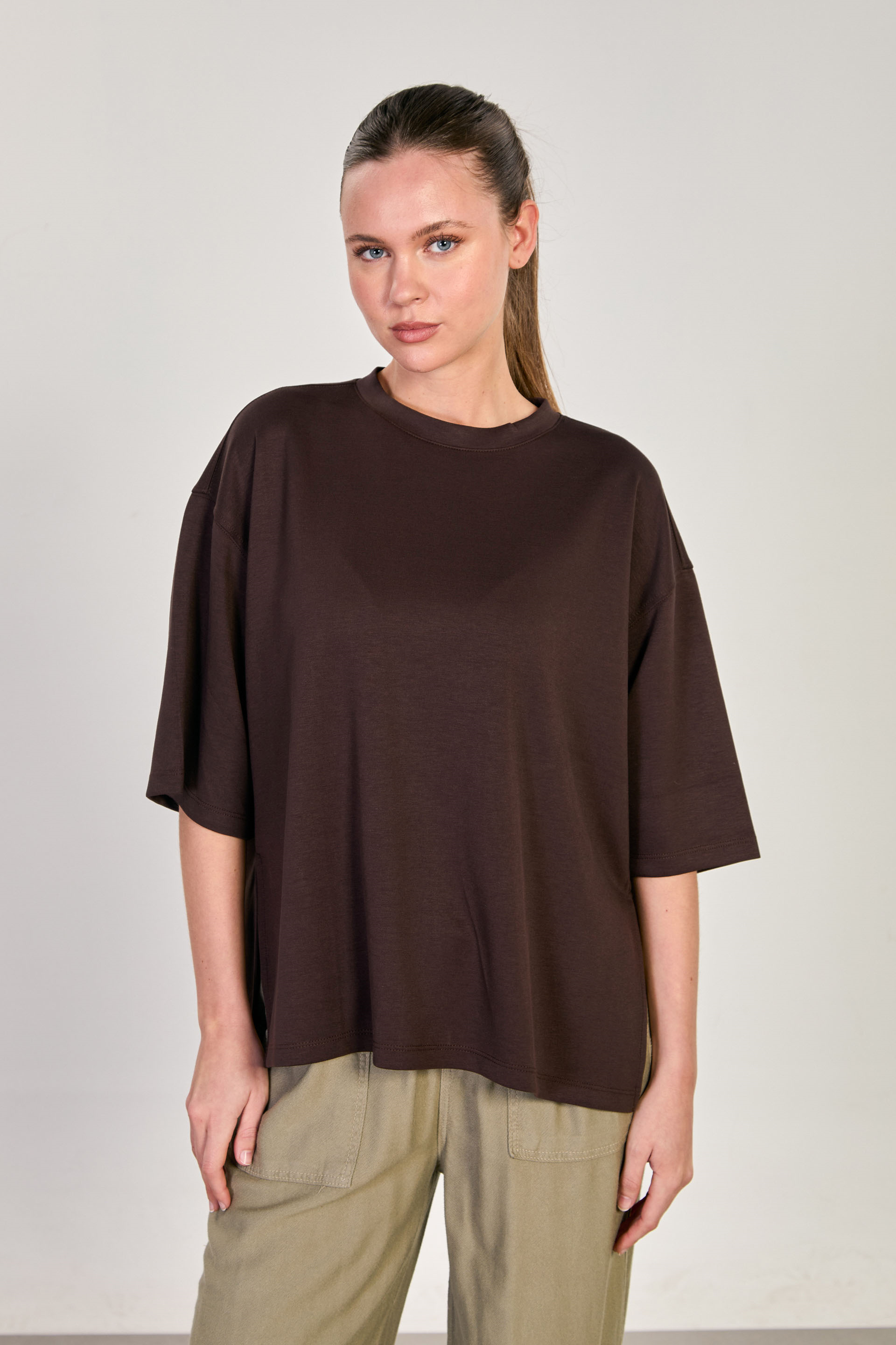 Kadın Yanı Yırtmaçlı Oversize Modal T-Shirt - Acı Kahve