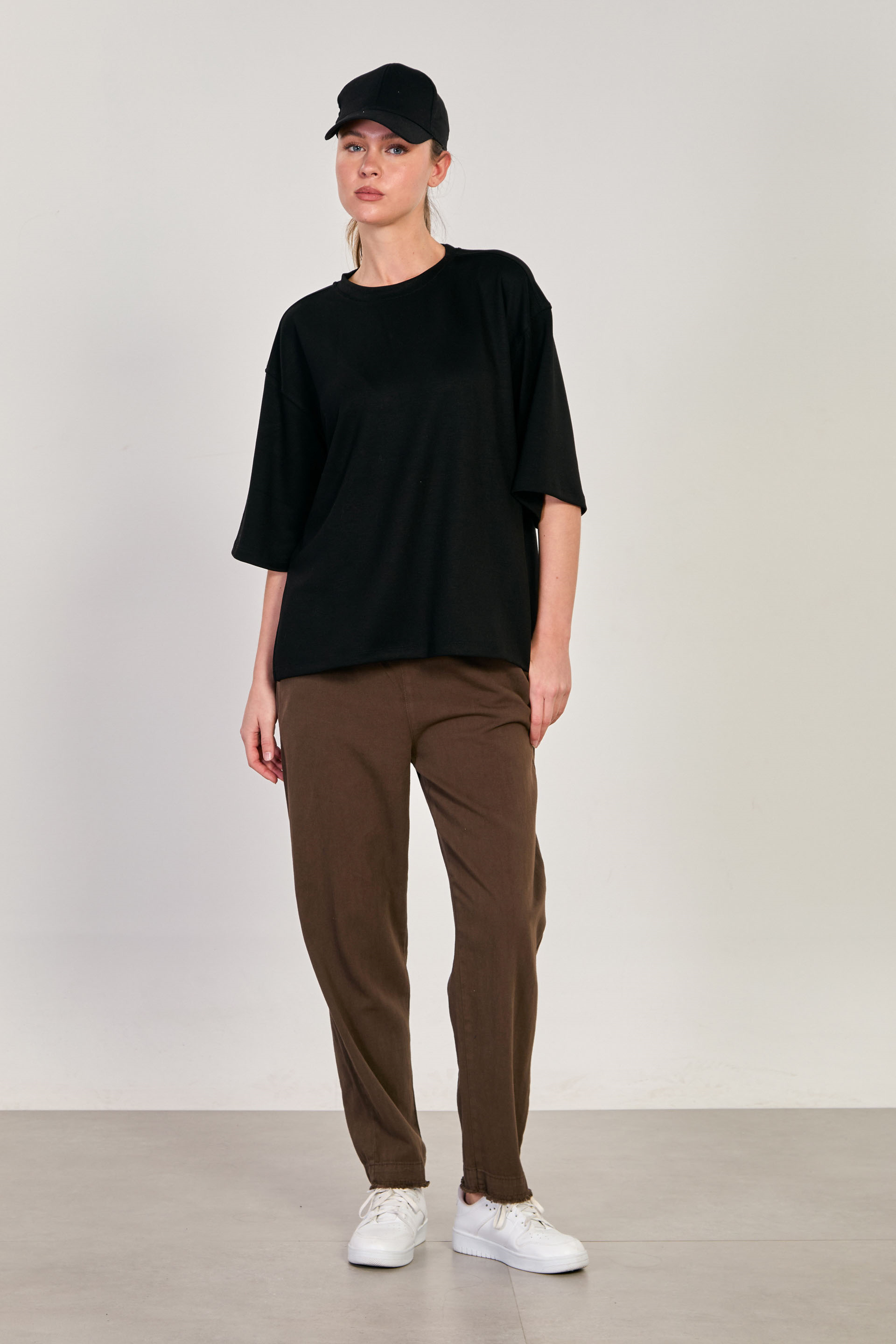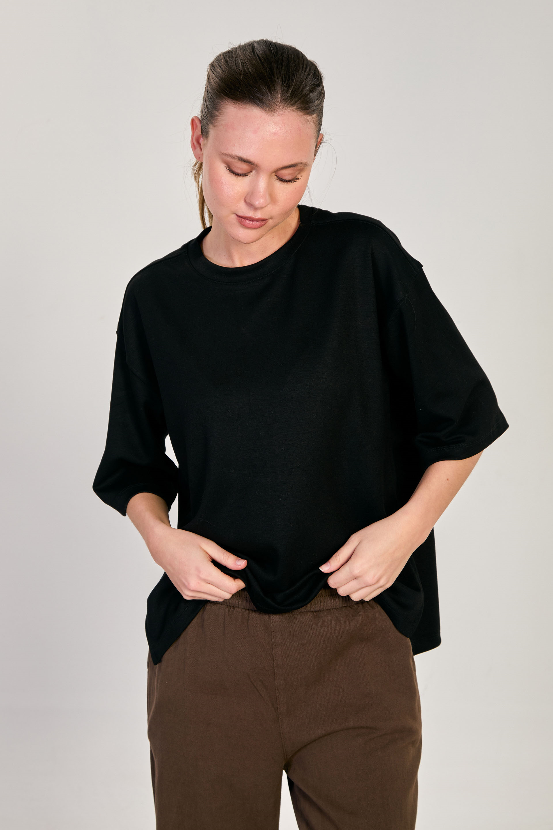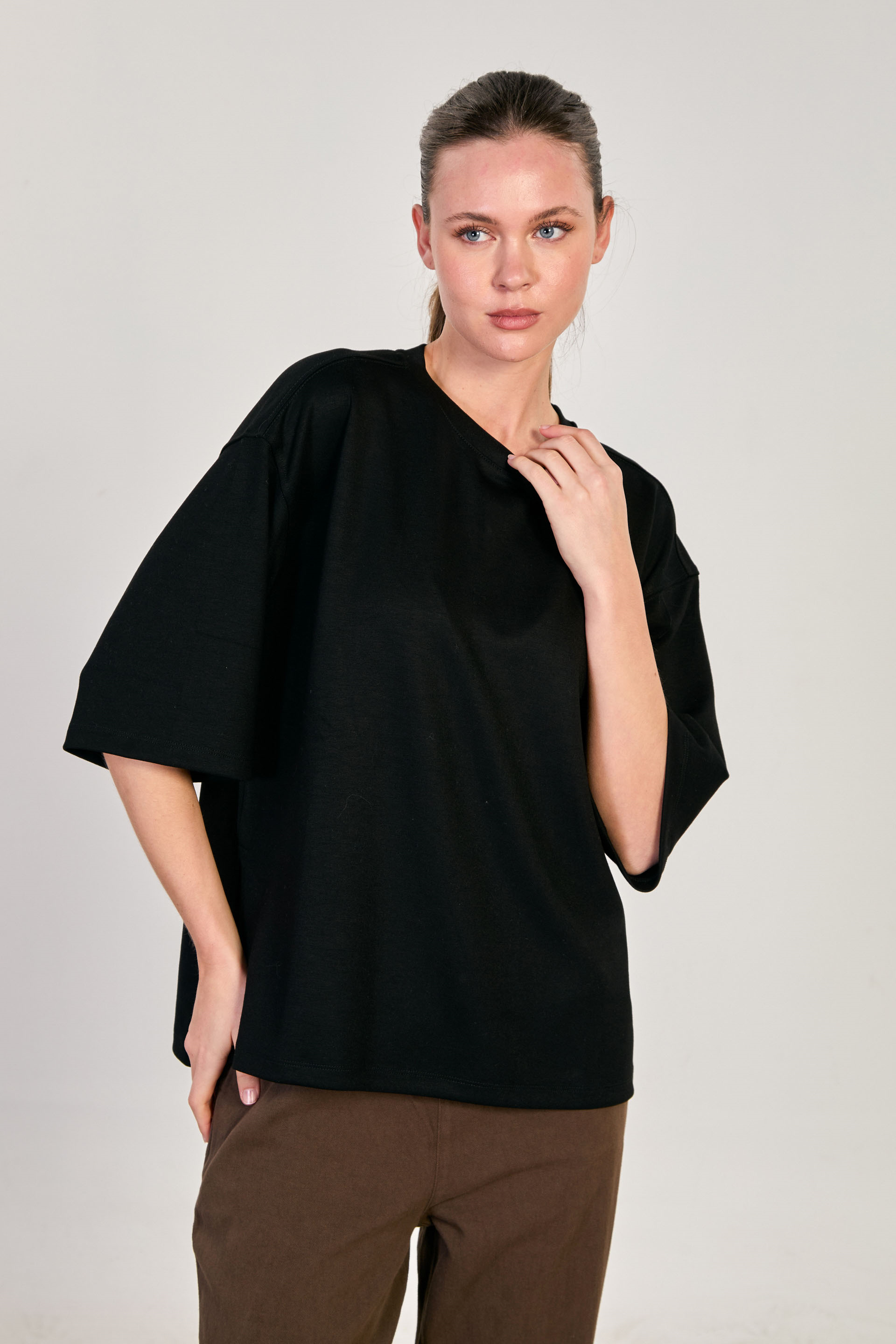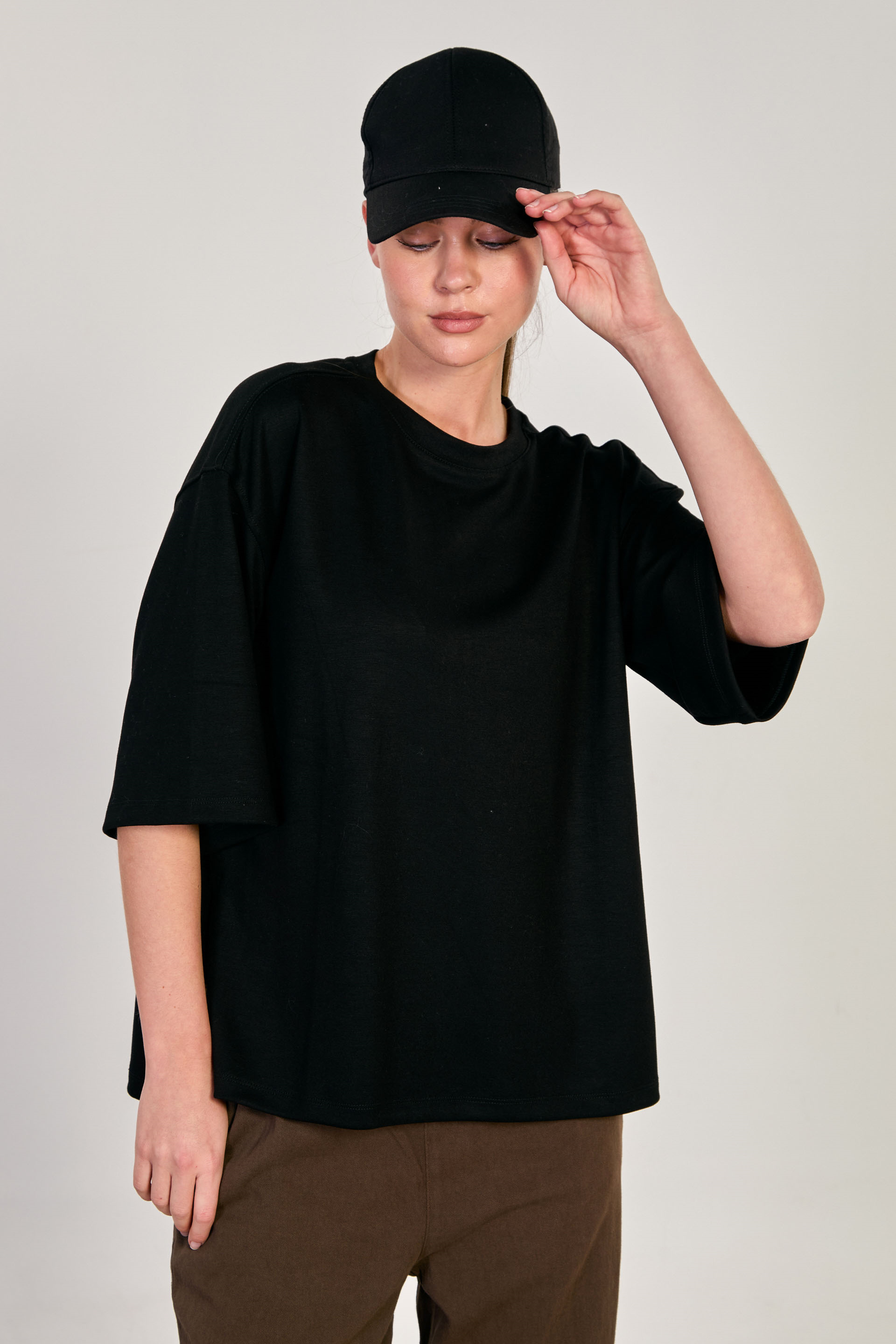Kadın Yanı Yırtmaçlı Oversize Modal T-Shirt - Siyah