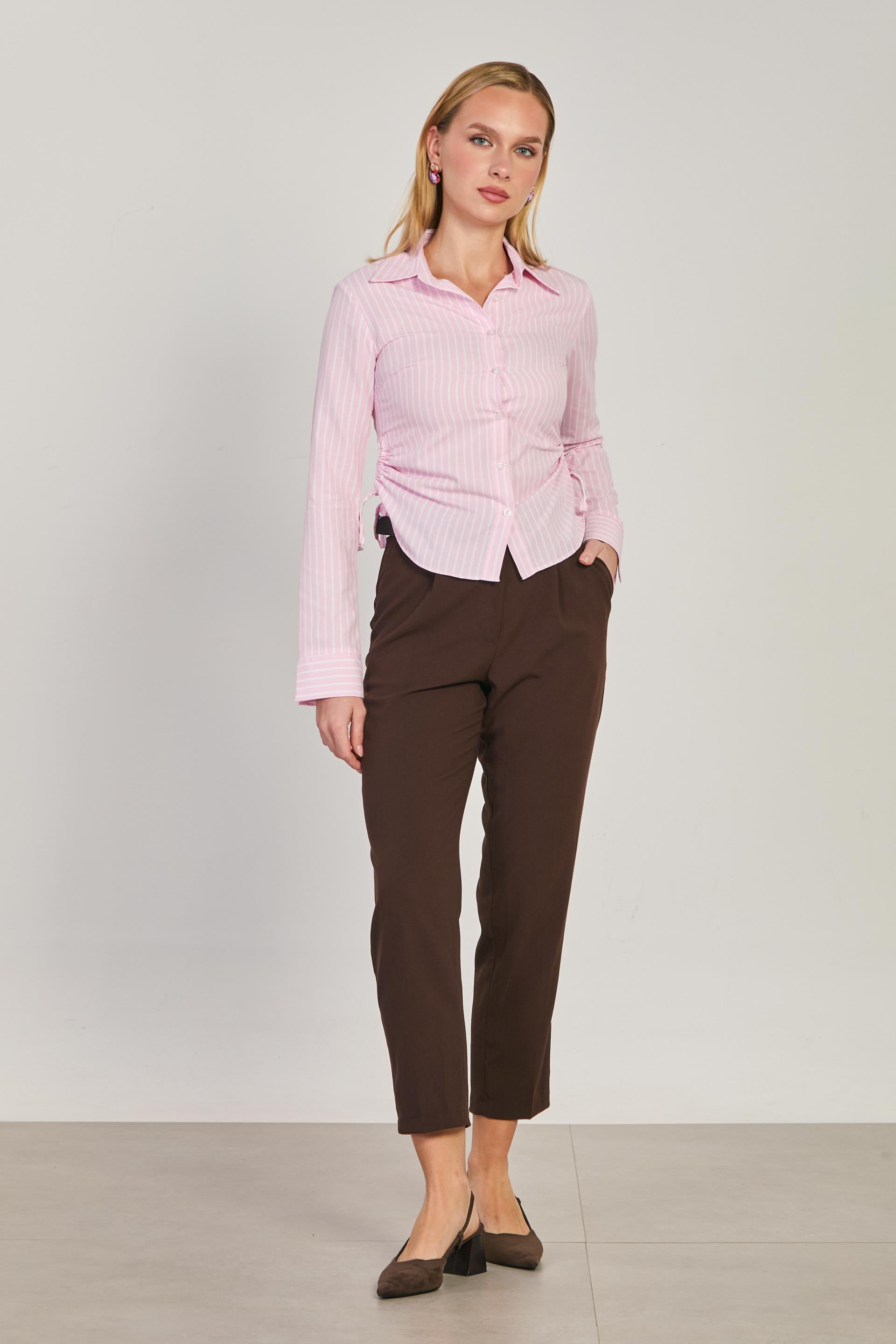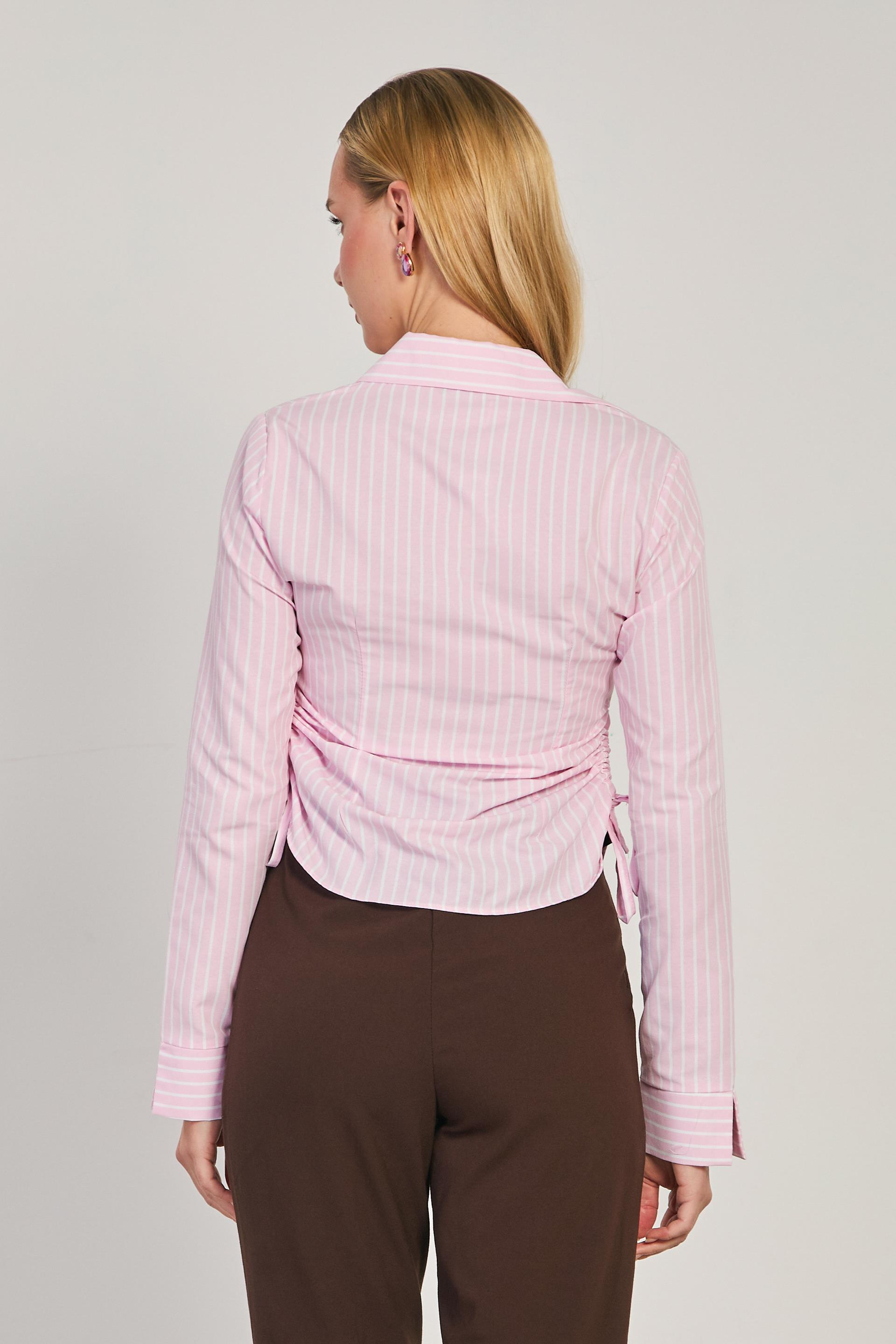 Kadın Yanları Büzgülü Çizgili Gömlek - Pembe