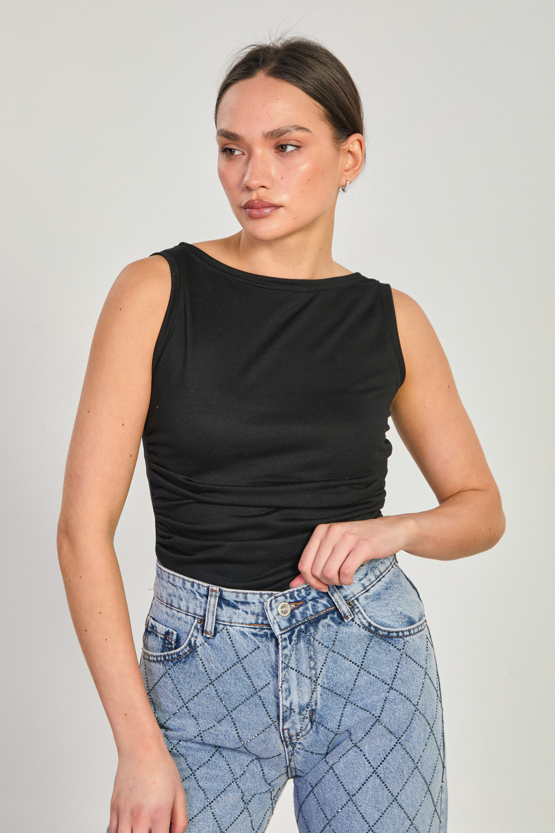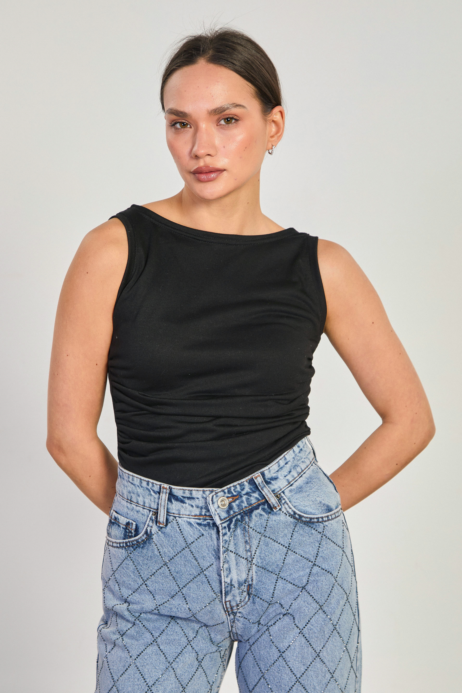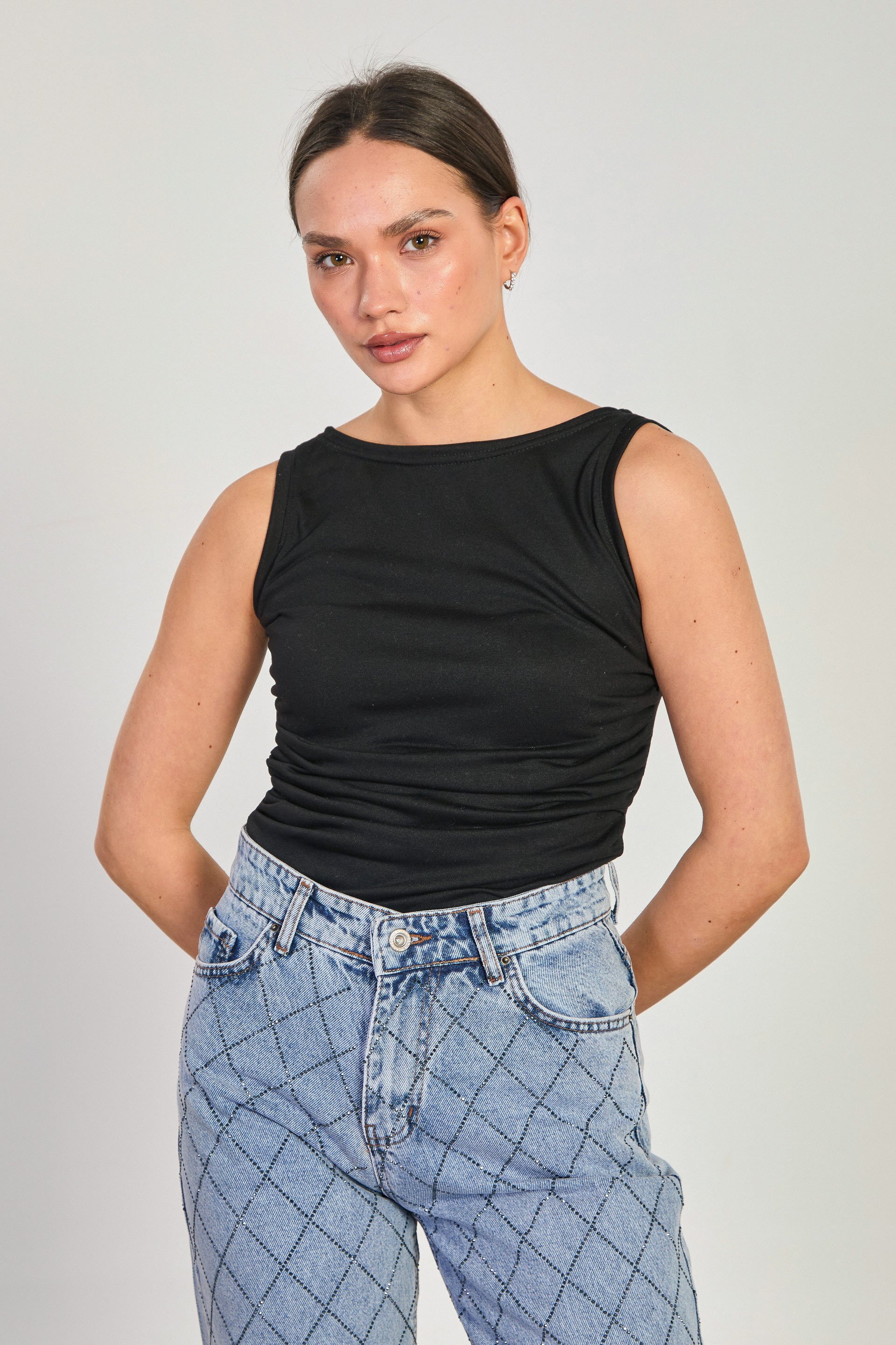Kadın Yanları Büzgülü Kayık Yaka Body - Siyah