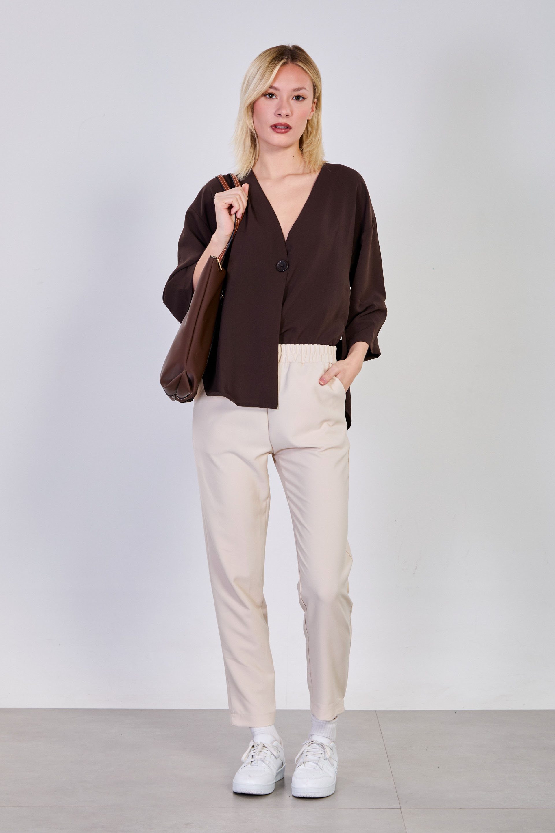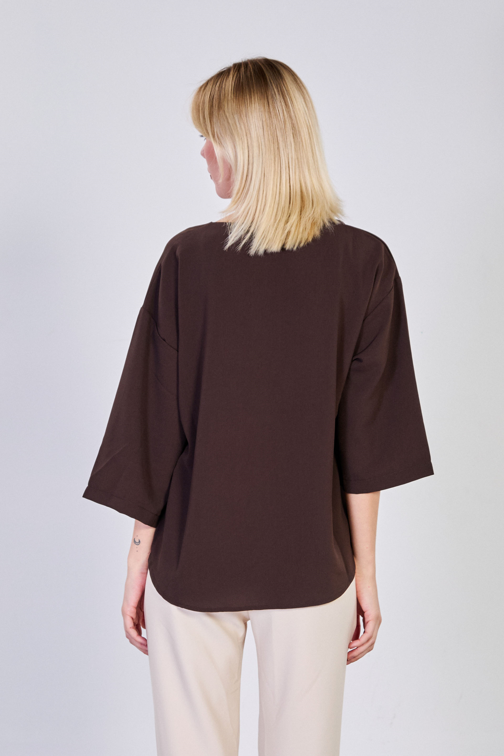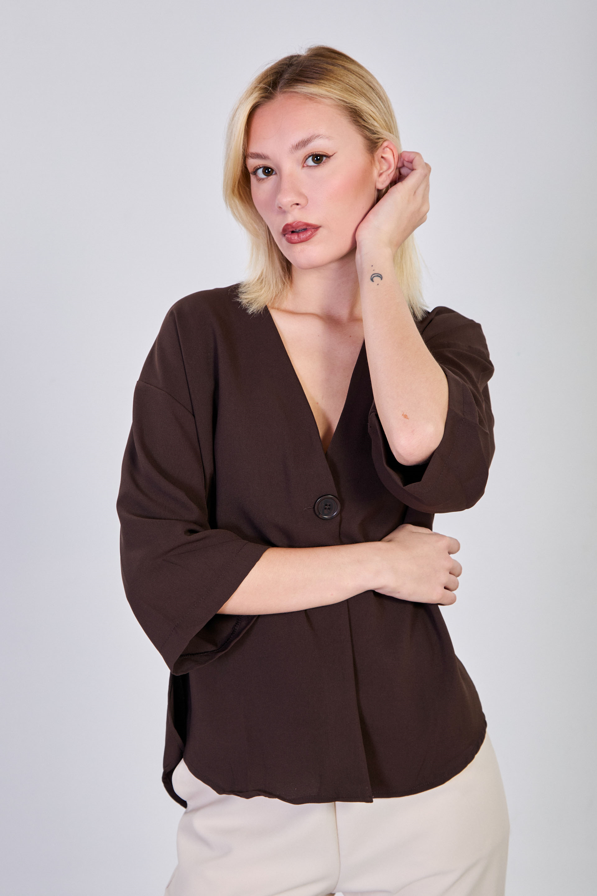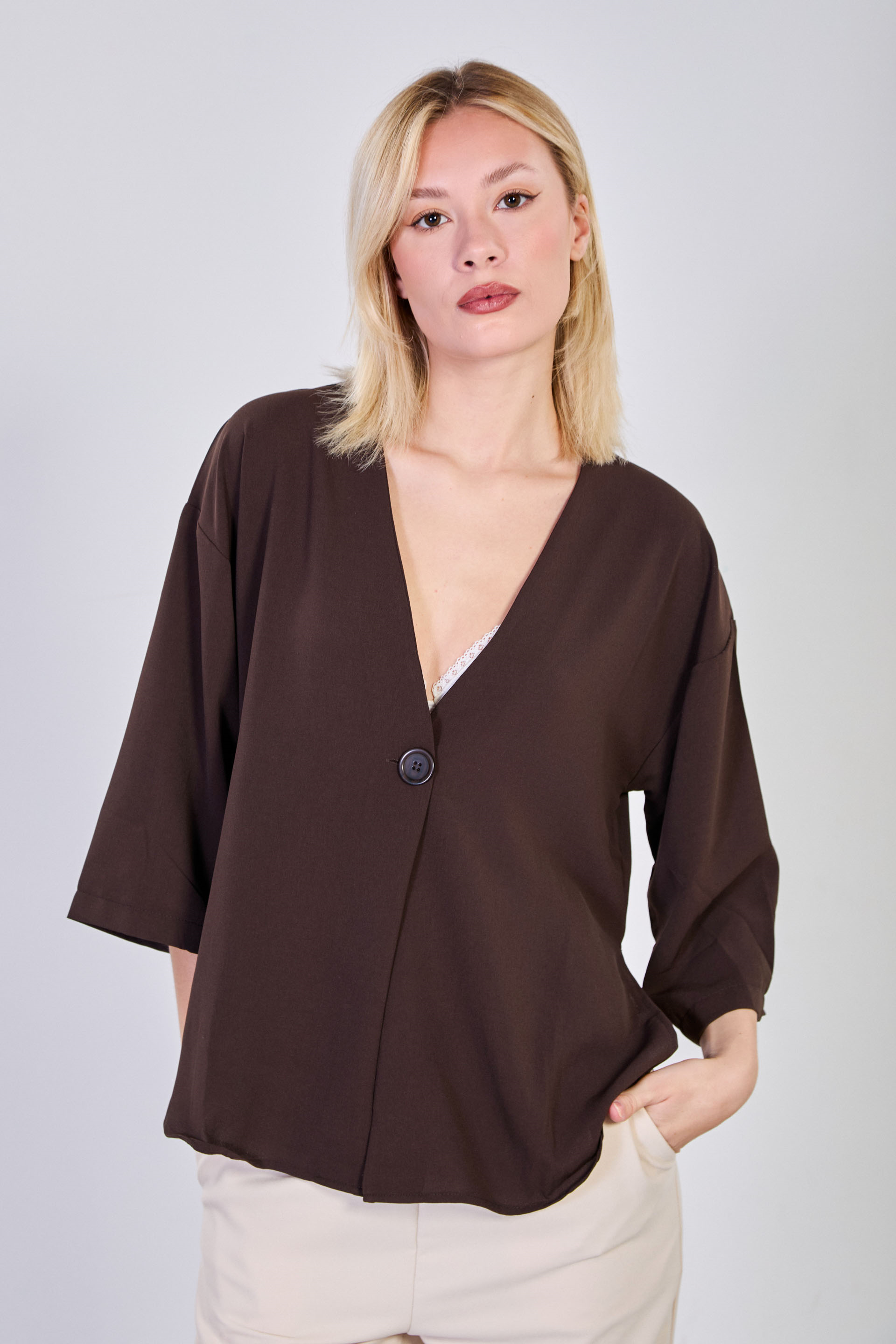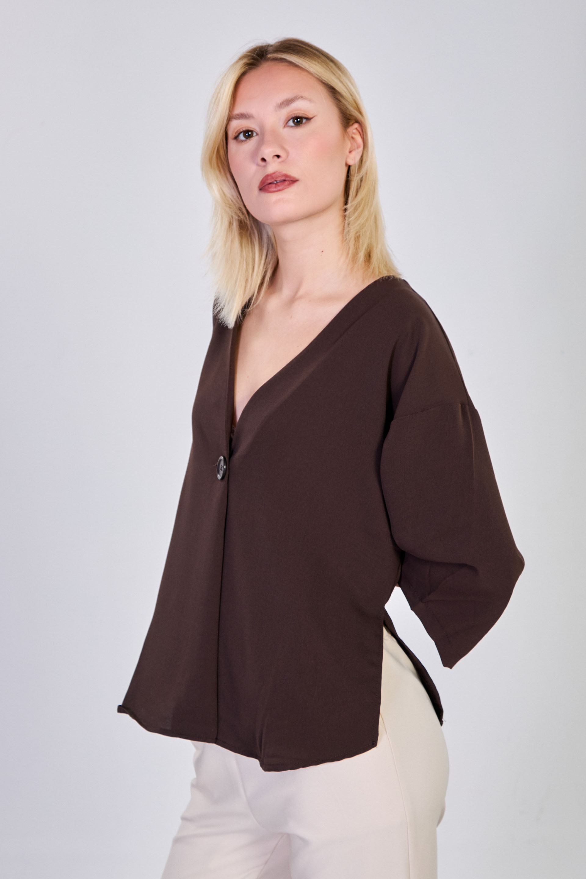 Kadın Yanları Yırtmaçlı Tek Düğmeli Bluz - Acı Kahve