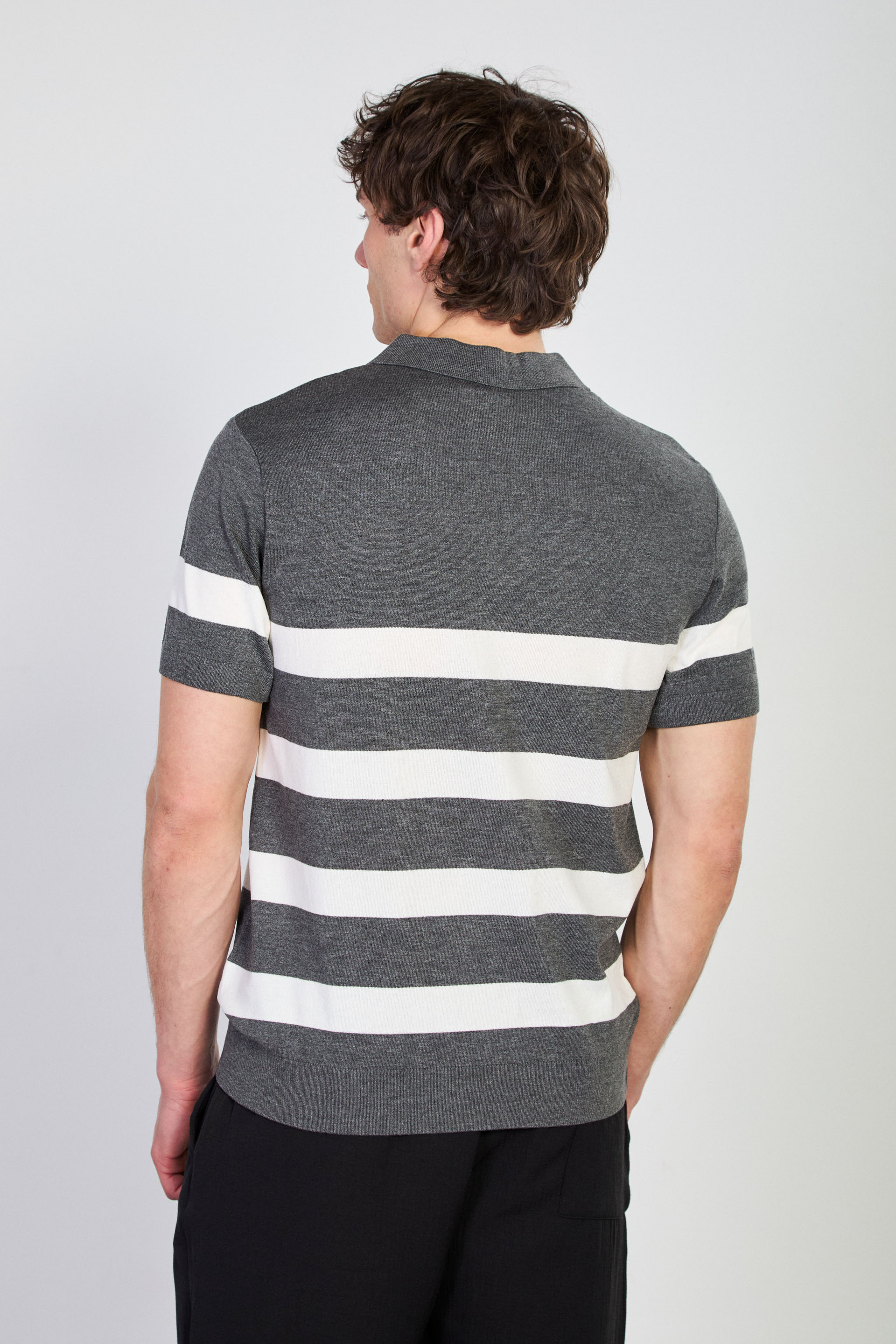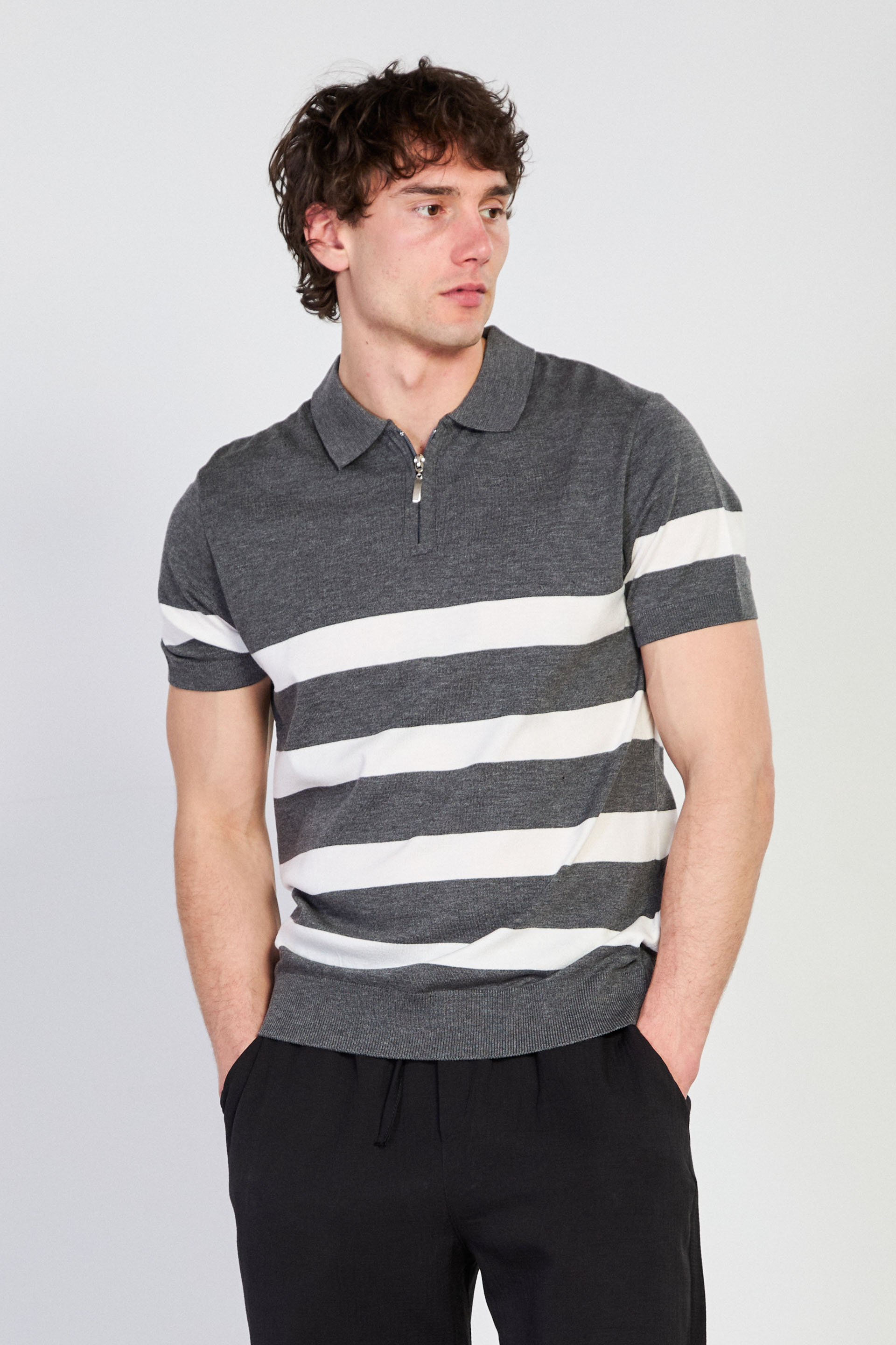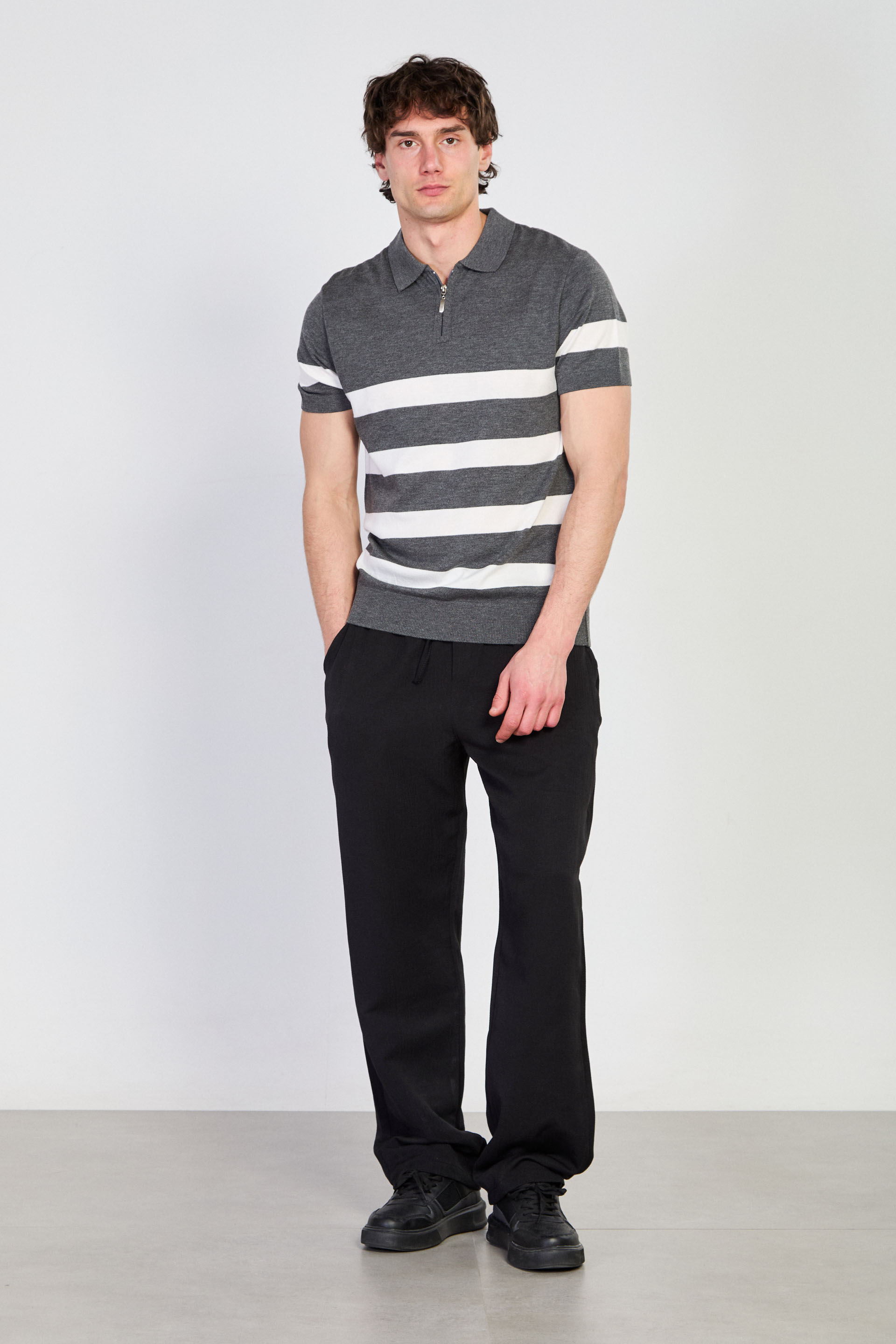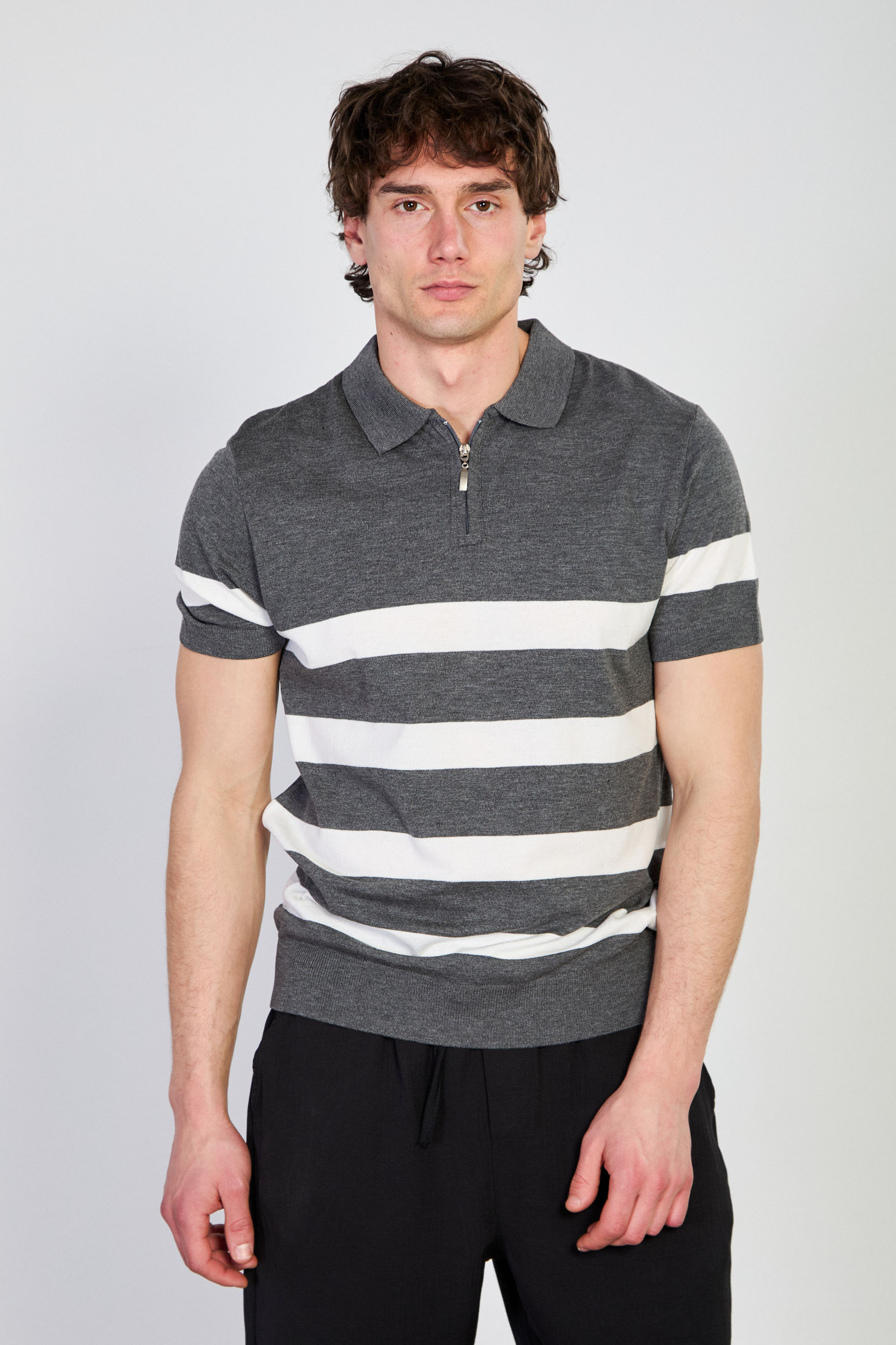 Erkek Yarım Fermuarlı Çizgili Polo Yaka T-Shirt - Antrasit