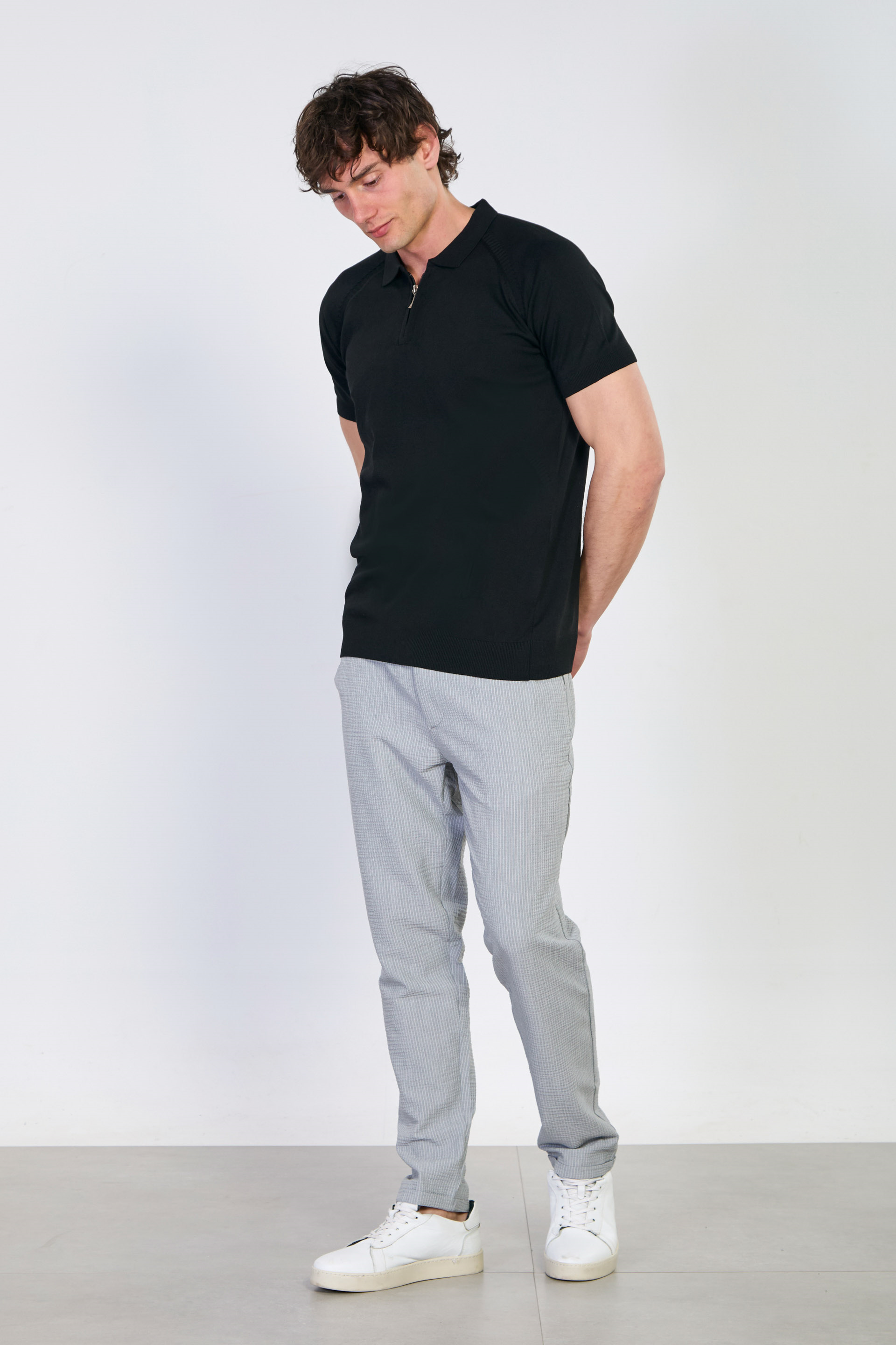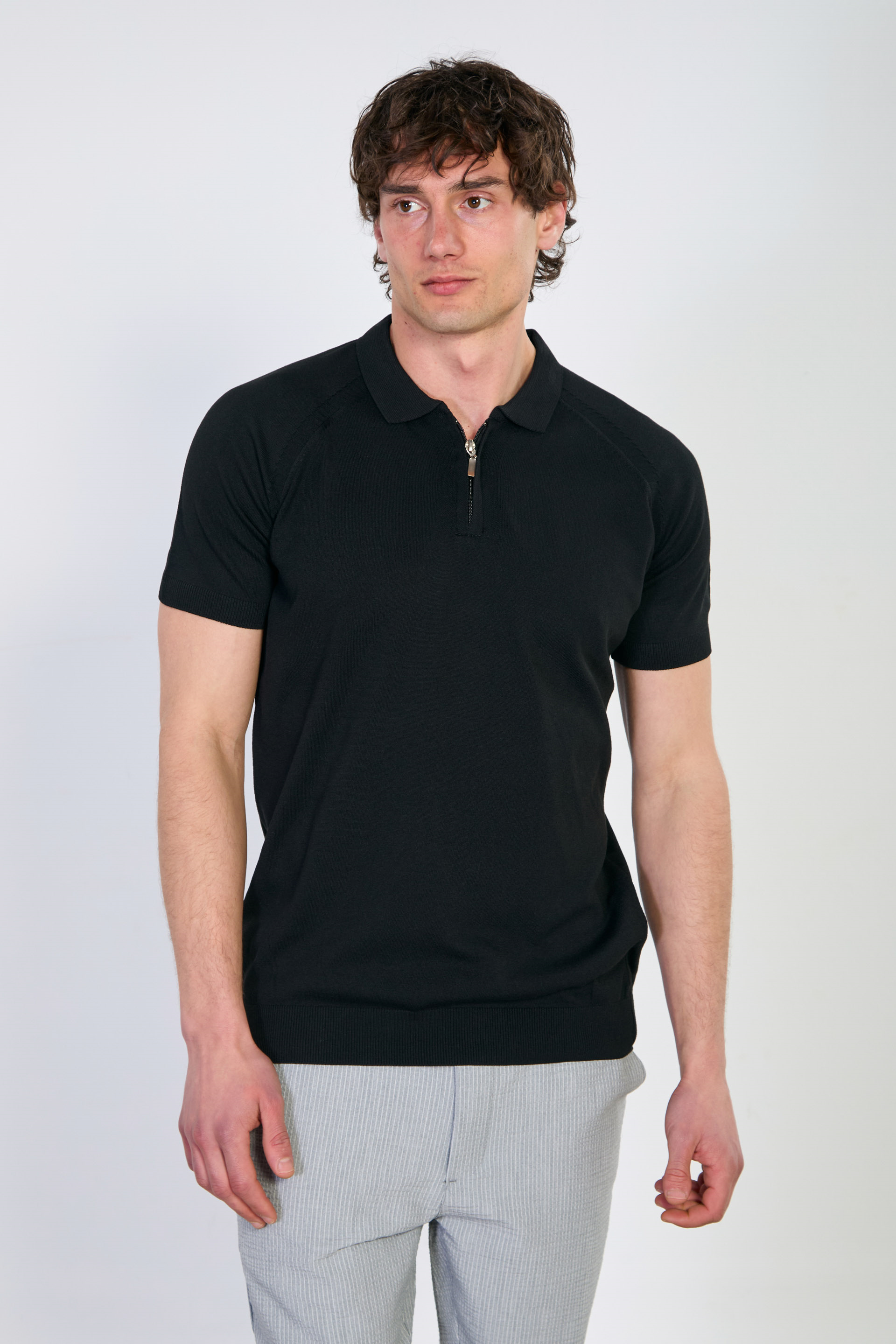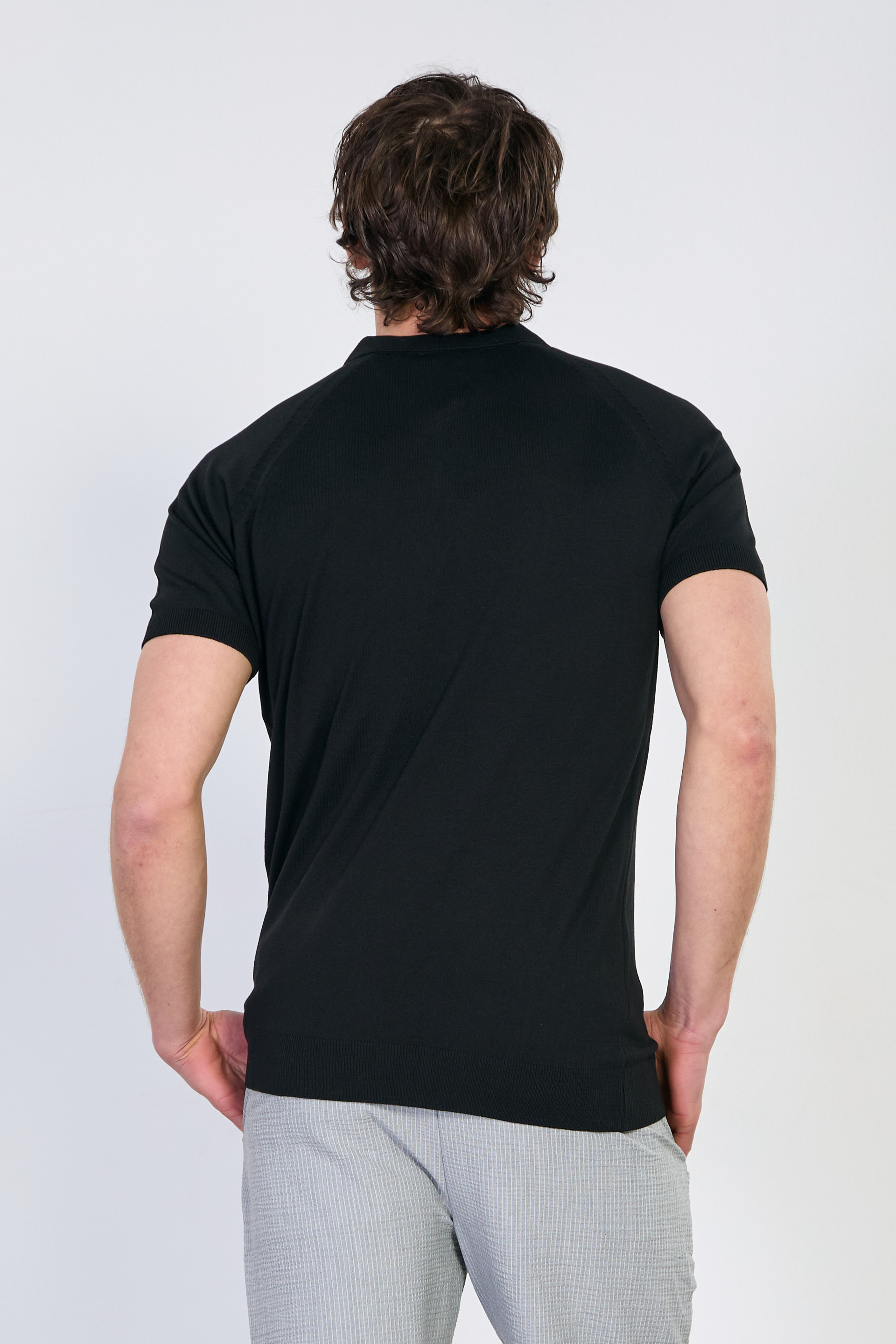 Erkek Yarım Fermuarlı Polo Yaka Triko T-Shirt - Siyah