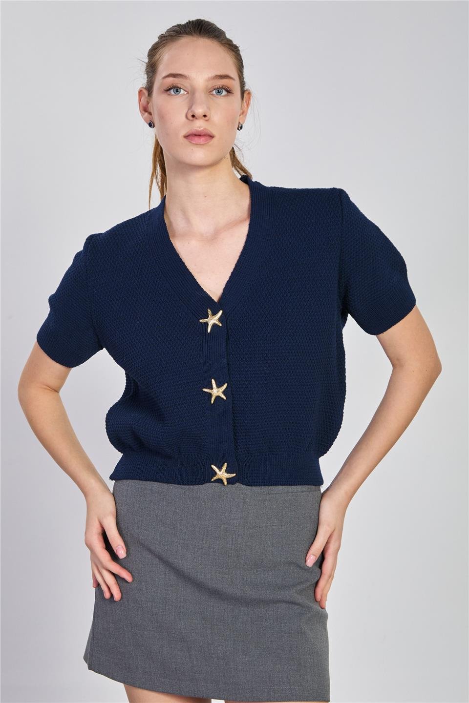 Kadın Yıldız Düğmeli Çıtçıtlı Triko Hırka - Lacivert
