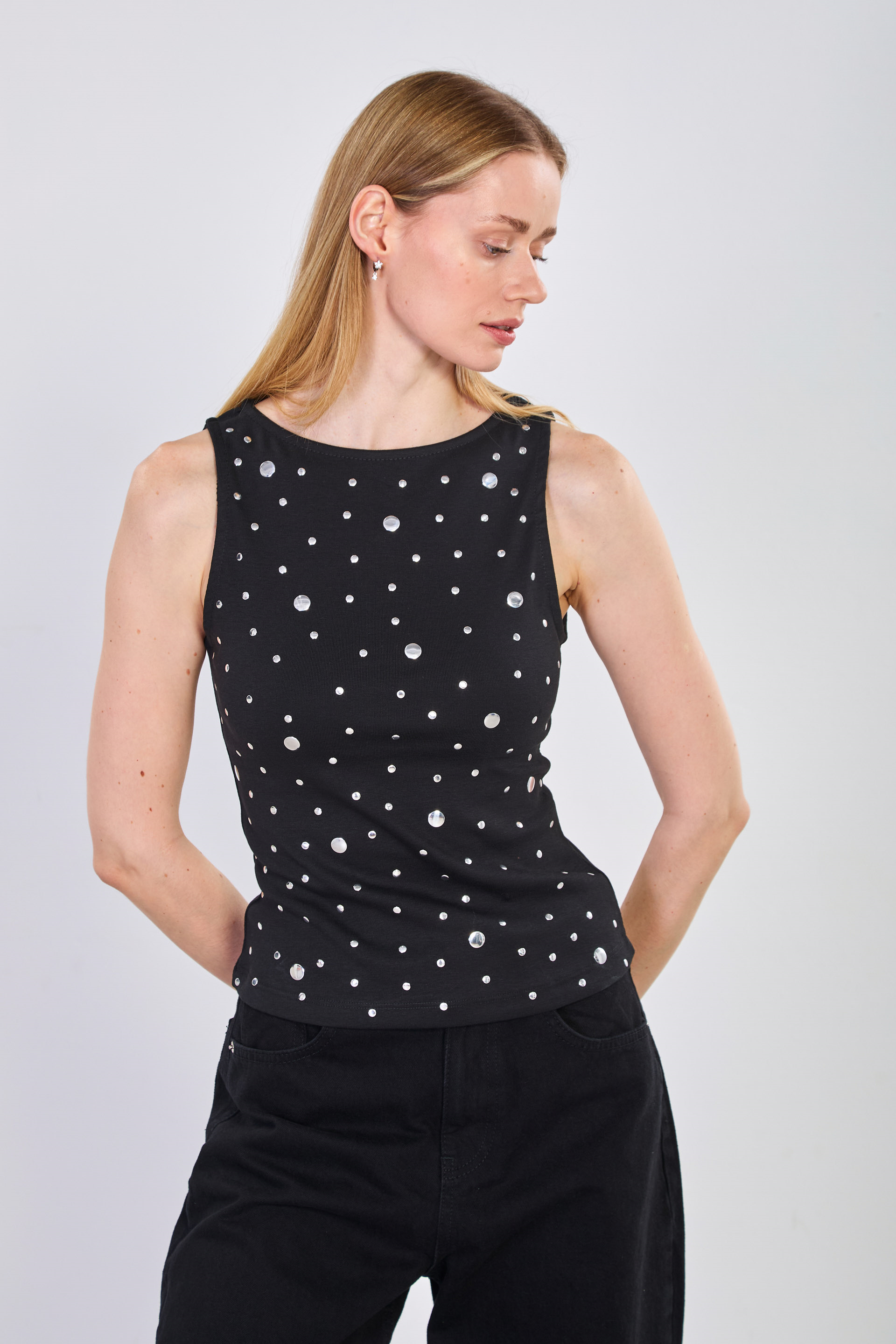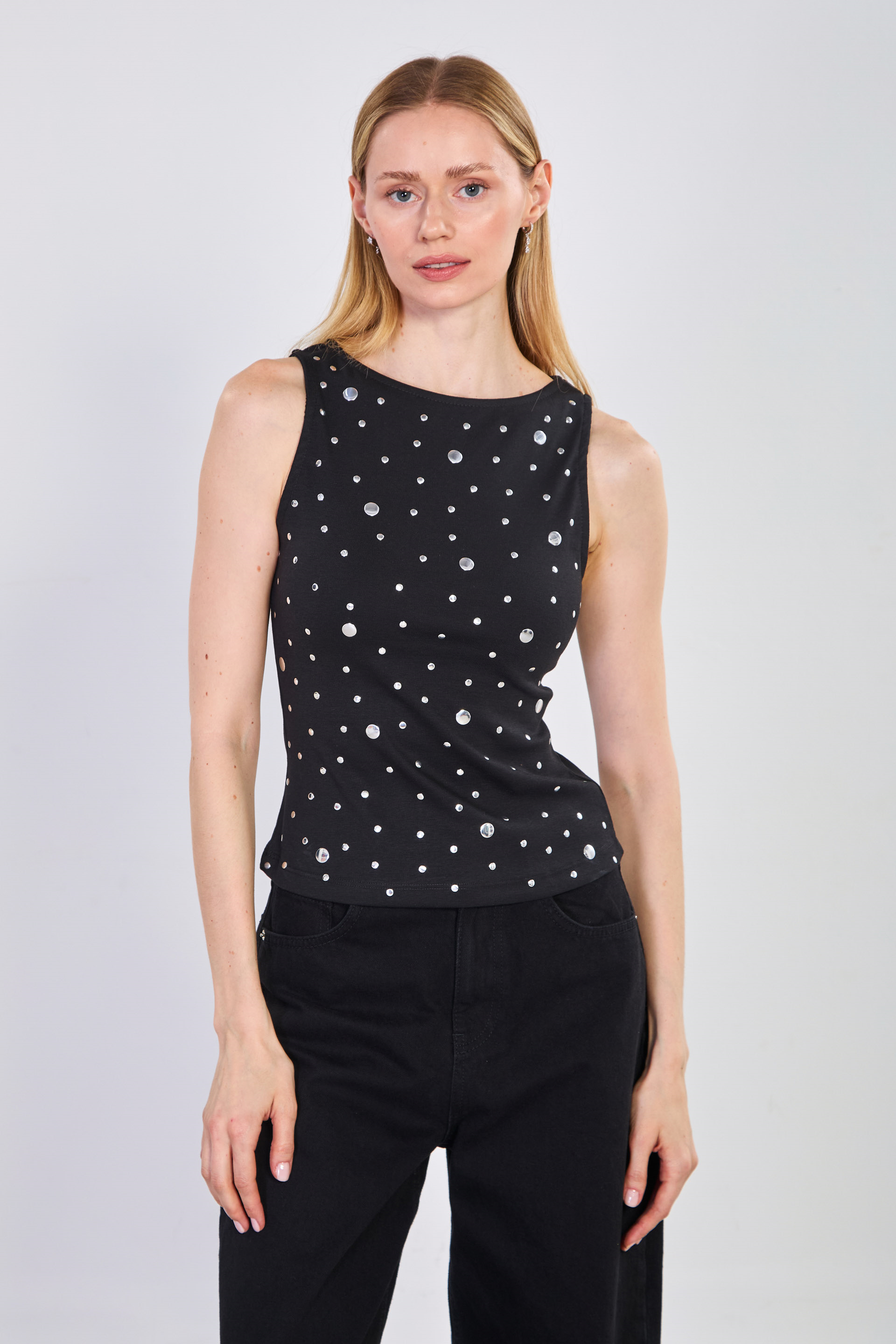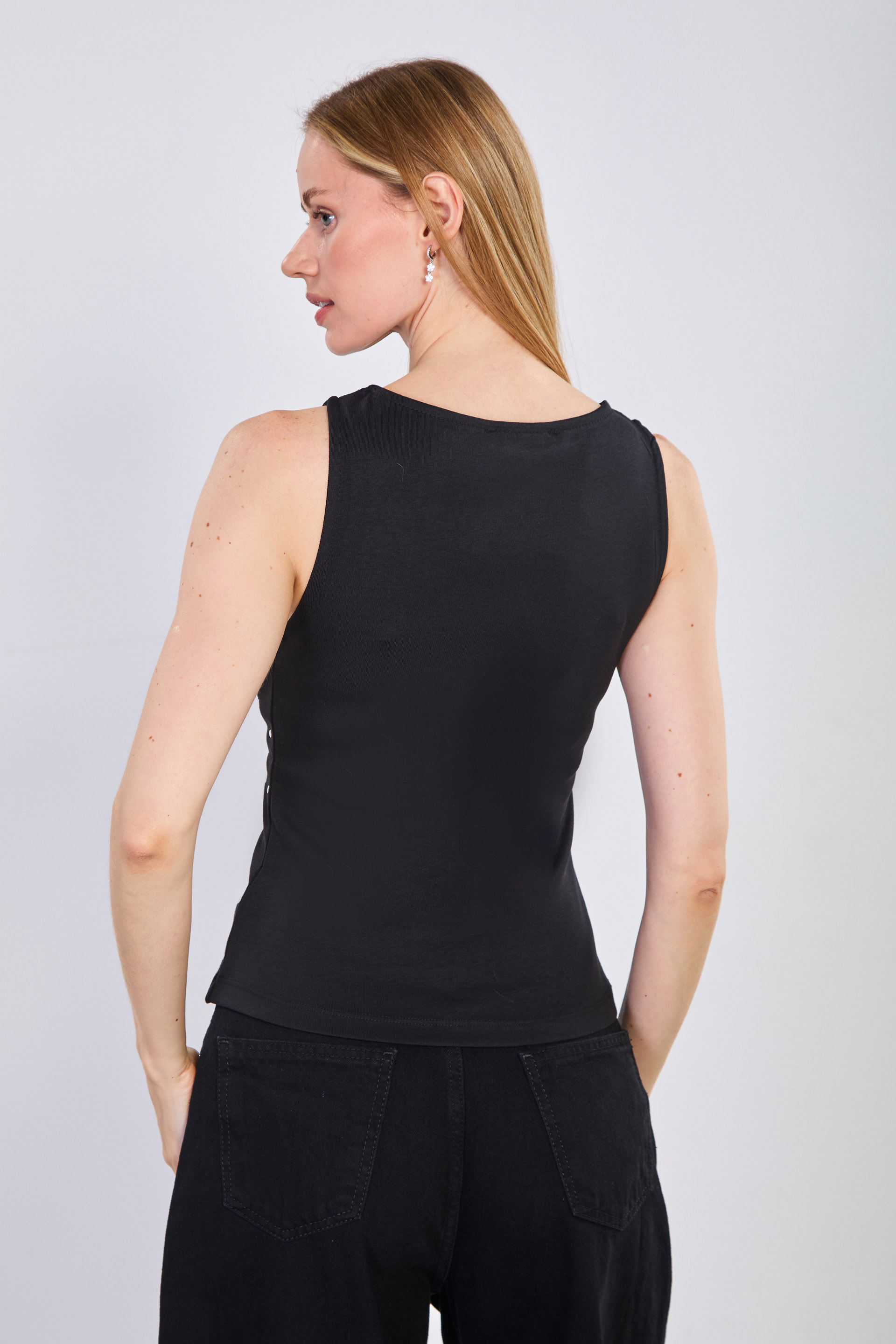 Kadın Zımbalı Kolsuz Body - Siyah